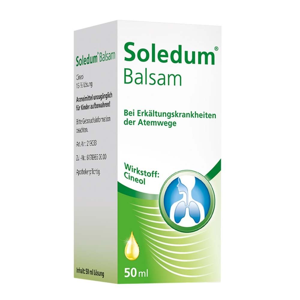 Soledum 50ml META PreisvergleichMit dem Meta-Preisvergleich suchen Sie gleichzeitig bei den großen Preisvergleich Portalen!Jetzt live Suche nach soledum 50ml starten! Soledum 50ml KaufberatungSoledum Balsam flüssig 50 ml ist ein apothekenpflichtiges Arzneimittel mit dem pflanzlichen Wirkstoff Cineol (15% Lösung) von MCM Klosterfrau Vertr. GmbH zur äußeren Anwendung bei Erkältungssymptomen der Atemwege wie Schnupfen, Husten, Heiserkeit oder Nebenhöhlenkatarrh. Es löst zähen Schleim, wirkt entzündungshemmend und bronchienerweiternd - einreibbar auf Brust/Rücken, zur Dampfinhalation oder als Badezusatz.[1][2][3][4][6] Wichtige Hinweise zur Anwendung und Sicherheit