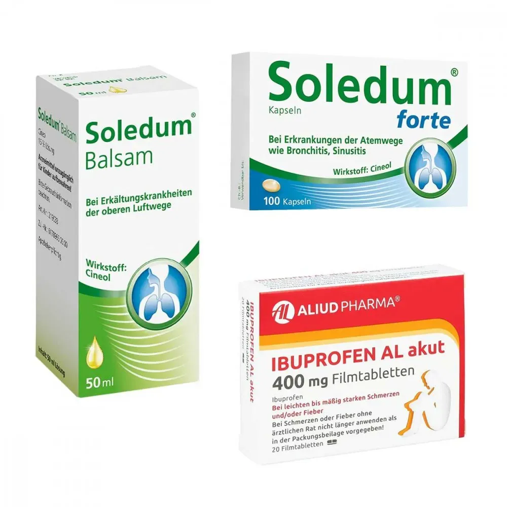 Verfügbarkeit: Auf Lager - 0.39 / Stück - Kategorie: Arzneimittel - Klosterfrau - GTIN:4150158893736 - Menge: 100stk Zur Zusatzbehandlung bei chronischen und entzündlichen Erkrankungen der Atemwege wie COPD und Asthma Für Erwachsene und Heranwachsende ab 1 n Zu Risiken und Nebenwirkungen lesen Sie die Packungsbeilage und fragen Sie Ihre ärztin, Ihren Arzt oder in Ihrer Apotheke. - 38,63 Euro bei Amazon Marketplace Health & Personal Care - gefunden von billiger.de Dieses Erkältungsset bietet eine Kombination aus Soledum und Ibuprofen zu einem attraktiven Preis. ![]() ![]() Erkältungsset Soledum und Ibuprofen