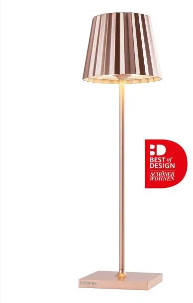Kategorie: Gartenbeleuchtung - SOMPEX - GTIN:4029599112709 - Sompex Troll 2.0 Tischleuchte stilvolles Licht für Indoor Outdoor Die Sompex Troll 2.0 Tischleuchte ist der perfekte Begleiter für gemütliche Abende drinnen wie draußen. Mit ihrem unverwechselbaren Plissee-Schirm, der in verschiedenen modernen Farben erhältlich ist, setzt die Leuchte charmante Akzente und sorgt für eine stimmungsvolle Atmosphäre. Dank der Schutzart IP54 ist sie sowohl für den Innenbereich als auch für den Outdoor-Einsatz geeignet ob im Wohnzimmer, auf dem Balkon oder im Garten. Kabellos, praktisch vielseitig Die Troll 2.0 punktet mit einem leistungsstarken Akku, der bis zu 24 Stunden kabelloses Licht ermöglicht. über den Touch-Sensor auf der Oberseite können Sie die Leuchte stufenlos dimmen und zwischen zwei warmweißen Lichtfarben (2700 K 3000 K) wählen. Damit passt si... - 169,00 Euro bei ichliebedesign.de - gefunden von billiger.de Diese Akku-Tischleuchte in Rosegold ist eine stilvolle Wahl für alle, die einen besonderen Akzent setzen möchten. ![]() ![]() Sompex TROLL 2.0 - Rosegold, Akku-Tischleuchte