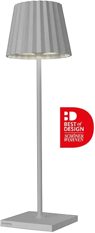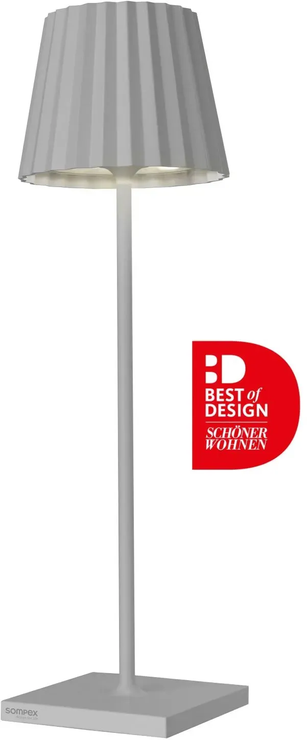Kategorie: Gartenbeleuchtung - SOMPEX - GTIN:4029599099734 - Sompex Troll 2.0 Tischleuchte stilvolles Licht für Indoor Outdoor Die Sompex Troll 2.0 Tischleuchte ist der perfekte Begleiter für gemütliche Abende drinnen wie draußen. Mit ihrem unverwechselbaren Plissee-Schirm, der in verschiedenen modernen Farben erhältlich ist, setzt die Leuchte charmante Akzente und sorgt für eine stimmungsvolle Atmosphäre. Dank der Schutzart IP54 ist sie sowohl für den Innenbereich als auch für den Outdoor-Einsatz geeignet ob im Wohnzimmer, auf dem Balkon oder im Garten. Kabellos, praktisch vielseitig Die Troll 2.0 punktet mit einem leistungsstarken Akku, der bis zu 24 Stunden kabelloses Licht ermöglicht. über den Touch-Sensor auf der Oberseite können Sie die Leuchte stufenlos dimmen und zwischen zwei warmweißen Lichtfarben (2700 K 3000 K) wählen. Damit passt si... - 139,00 Euro bei ichliebedesign.de - gefunden von billiger.de Diese Outdoor Tischleuchte in Grau ist eine solide und preiswerte Option für den Außenbereich. ![]() ![]()