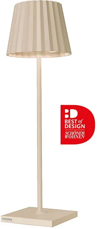 Kategorie: Gartenbeleuchtung - SOMPEX - GTIN:4029599109884 - TROLL 2.0 Akku-Tischleuchte Sand Die TROLL 2.0 ist die elegante Akku-Tischleuchte mit dem unverkennbaren Plissee-Schirm perfekt für den Innen- und Außenbereich. Gefertigt aus hochwertigem Aluminium und in der modernen Farbe Sand beschichtet, überzeugt sie mit stilvollem Design und robuster Verarbeitung. Dank der IP54-Klassifizierung ist sie wetterfest und ideal für Balkon, Terrasse oder Wohnräume. Die integrierten Akkus bieten bis zu 24 Stunden kabelloses Licht. über den Touch-Sensor auf der Oberseite lässt sich die Leuchte stufenlos dimmen und zwischen zwei warmweißen Lichtfarben (2.700 K und 3.000 K) umschalten. Die mitgelieferte Ladestation sorgt für ein schnelles, einfaches Aufladen. Vorteile und Eigenschaften Design: Moderner Plissee-Schirm aus Aluminium in der Farbe Sand stilvoll und zeitlos. Outdoor & Indoor geeignet: Dank IP54-Schutzklasse ideal für drinnen und draußen. Kabellos & flexibel: Leistungsstarker Akku mit bis zu 24 Stunden Laufzeit. Einfache Bedienung: Touch-Sensor zum stufenlosen Dimmen und Farbtemperaturwechsel. Schnelles Aufladen: Inklusive Ladestation, Ladezeit ca. 8 Stunden. Memory-Funktion: Speichert die letzte Helligkeitseinstellung. Technische Details Artikeltyp: TL (Tischleuchte) Marke: Sompex Design for Life Farbe: Sand Material: Aluminium Schutzart: IP54 (spritzwassergeschützt) Schutzklasse: III Leistung: 2,4 W Spannung: 3,7 V Lichtstrom: 230 lm Lichtfarbe: 2.700 3.000 K (warmweiß, 2 ... Diese Akku-Tischleuchte in Grau ist eine preiswerte und beliebte Wahl für den Innen- und Außenbereich. ![]() ![]() Sompex-Lighting TROLL 2.0 Akku-Tischleuchte Grau