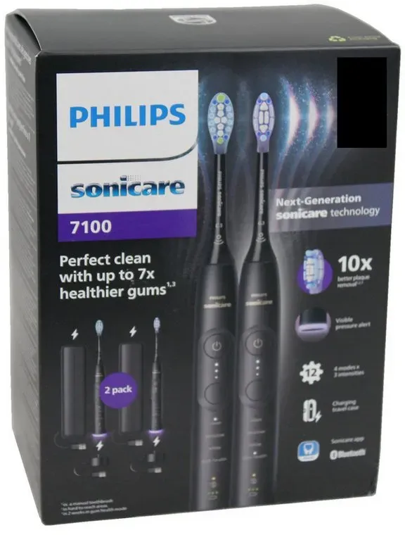 Auf Lager Versand durch AmazonPhilips Sonicare 7100 elektrische Zahnbürste, Schallzahnbürste mit App, 4 Putzmodi, 3 Intensitätsstufen, Andruckkontrolle, EasyStart, SmarTimer, Schwarz, 2er-Pack, Modell HX7429/03 [Neue Technologie]