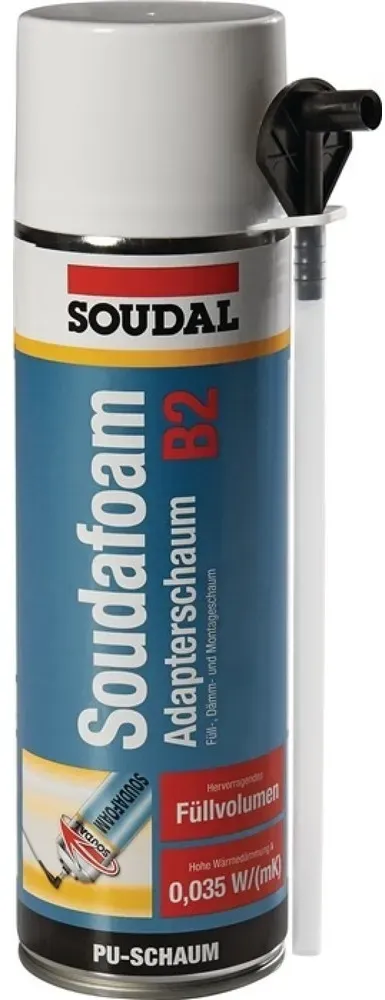 Baustoffe Rohbau & Trockenbau Dämmung PU-Schaum Baumaterialien - EAN:5411183007239 - Soudal Soudafoam B2 Montageschaum 750ml, Dämmschaum & Bauschaum Soudal Soudafoam B2 Montageschaum Adapterschaum 750 ml - Profi-Adapterschaum champagner Der Soudafoam B2 Montageschaum ist ein hochwertiger Profi-Adapterschaum, ideal für eine Vielzahl von Anwendungen in der Bau- und Isoliertechnik. Mit hervorragenden Dämmeigenschaften und hoher Formstabilität eignet sich dieser Montageschaum perfekt für das Ausschäumen von Hohlräumen, Fensterrahmen und Rohrdurchführungen. Produktmerkmale: Hohe Wärmedämmung λ 0,035 W/(m·K) Baustoffklasse B2 (gemäß DIN 4102, Teil 1) Sehr hohe Formstabilität: Kein Volumenschwund und keine Nachdehnung nach der Aushärtung Ausgezeichnete Haftung auf fast allen Bauuntergründen (außer PE, PP, PTFE und Silikone) Schnell schneidbar (nach ca. 30 Minuten) Beständig gegen eine Vielzahl von Lösemitteln, Farben, Chemikalien, Öl und Benzin Frost-, alterungs- und verrottungsbeständig, aber nicht UV-beständig (im Freien überstreichen oder abdichten) - gefunden von Kelkoo Dieser 1K Bauschaum Compact mit 150 ml ist ideal für kleinere Reparaturen und Füllarbeiten, wo nur eine geringe Menge benötigt wird. Manomano.d e