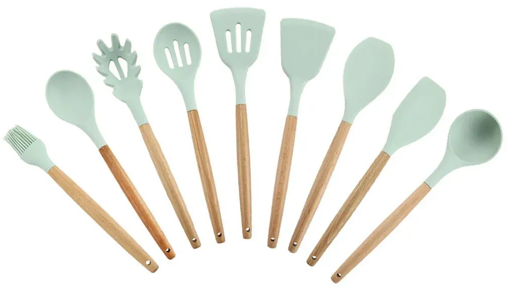 Kategorie: Backpinsel - Mozeat Lens - Farbiges Spatel-Set: Sie erhalten einen schwarzen, einen roten und einen blauen Silikonspatel zum Backen. Diese hellen Farben erleichtern Ihnen nicht nur die Unterscheidung, sondern verleihen Ihrer Küche auch eine künstlerische Note. Griffdesign Unsere Spatel für die Küche haben einen 20,3 cm langen Griff, mit dem Sie leicht den Boden und die Ecken des Glases erreichen können, damit Sie die Lebensmittel im Glas bequemer herausnehmen können. Qualität Unsere Silikon-Glasspatel bestehen aus Silikonmaterial, das stark ist, und die weiche und glatte Oberfläche zerkratzt Ihr Antihaft-Kochgeschirr nicht. Darüber hinaus sind diese Glasspatel robust, wodurch sie ideal für den langfristigen Gebrauch sind. Größe & Aufhängen Unser Silikon-Spatelrührer misst ungefähr 20,8 x 4,5 cm (8,2 x 1,8 Zoll). Darüber hinaus ist der Griff jedes Spatels auch mit einem Loch zum Aufhängen ausgestattet, und Sie können sie an einen Haken hängen, was Platz in Ihrer Küche sparen kann. Multifunktions-Werkzeug: Unsere Silikon-Glasspatel können als Sandwich-Streuer, Butterlöffel, Zuckerguss-Spatel und mehr verwendet werden. Es kann auch zum Kochen, Backen, Rühren usw. verwendet werden. - 16,83 Euro bei Amazon Marketplace Home - gefunden von billiger.de Ein solides 9-teiliges Küchenhelfer-Set für den täglichen Gebrauch. ![]() ![]() jedbesetzt Chef Küchenutensilien-Set, antihaftbeschichtet, Silikon, Küchenutensilien, Spachtel-Set Silikon, 9-teilig