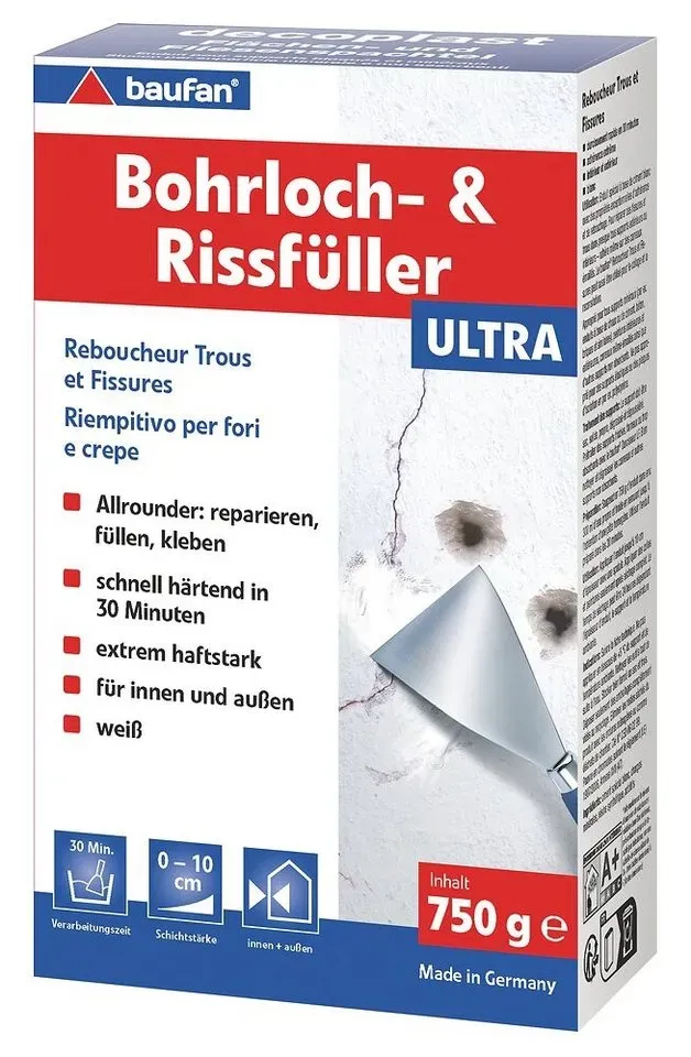 lieferbar-in 3-4 Werktagen bei dirbaufan Spachtelmasse Bohrloch- und Rissfüller ULTRA 750 g Spachtelmasse Bohrlochfüllung, zum Ausbessern von Rissen und Löchern weiß