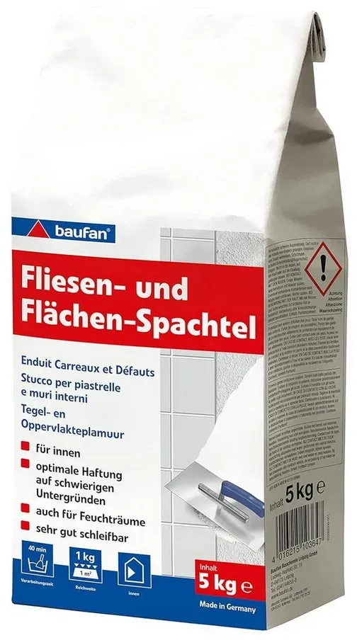 Gesamtsortiment Baumarkt + Garten Bauen + Renovieren Baustoffe Spachtelmasse + Mörtel Baumaterialien - EAN:4007591990037 - Molto Interior Repair Moltofill ist gebrauchsfertig und einfach anzuwenden. Es eignet sich ideal für schnelle und kleine Innenreparaturen, wie das Füllen von Dübel Löchern und das Reparieren kleiner Risse oder abgebrochener Kanten. Repair Moltofill kann auf Untergründen wie Putz, Beton, Gipskarton, Zement, Mauerwerk, Polystyrol, Hartschaum, Glasgewebe, gestrichenen Oberflächen und lackierten Oberflächen verwendet werden. Es ist perfekt zum Ausbessern und Reparieren kleiner Löcher und Risse und ermöglicht das Füllen in nur einem Arbeitsschritt. - Verarbeitungstemperatur: ab +5 °C - Farbe: weiss - Trocknungszeit: Je nach Schichtdicke, Temperatur und Luftfeuchtigkeit etwa 2 Stunden. Technische Daten: Inhalt: 330 g Gewicht: 360 g. - gefunden von Kelkoo Der Baufan Fliesen- und Flächenspachtel ist ideal für Feuchträume wie Bad und Küche und bietet gute Haftung. ![]() ![]()