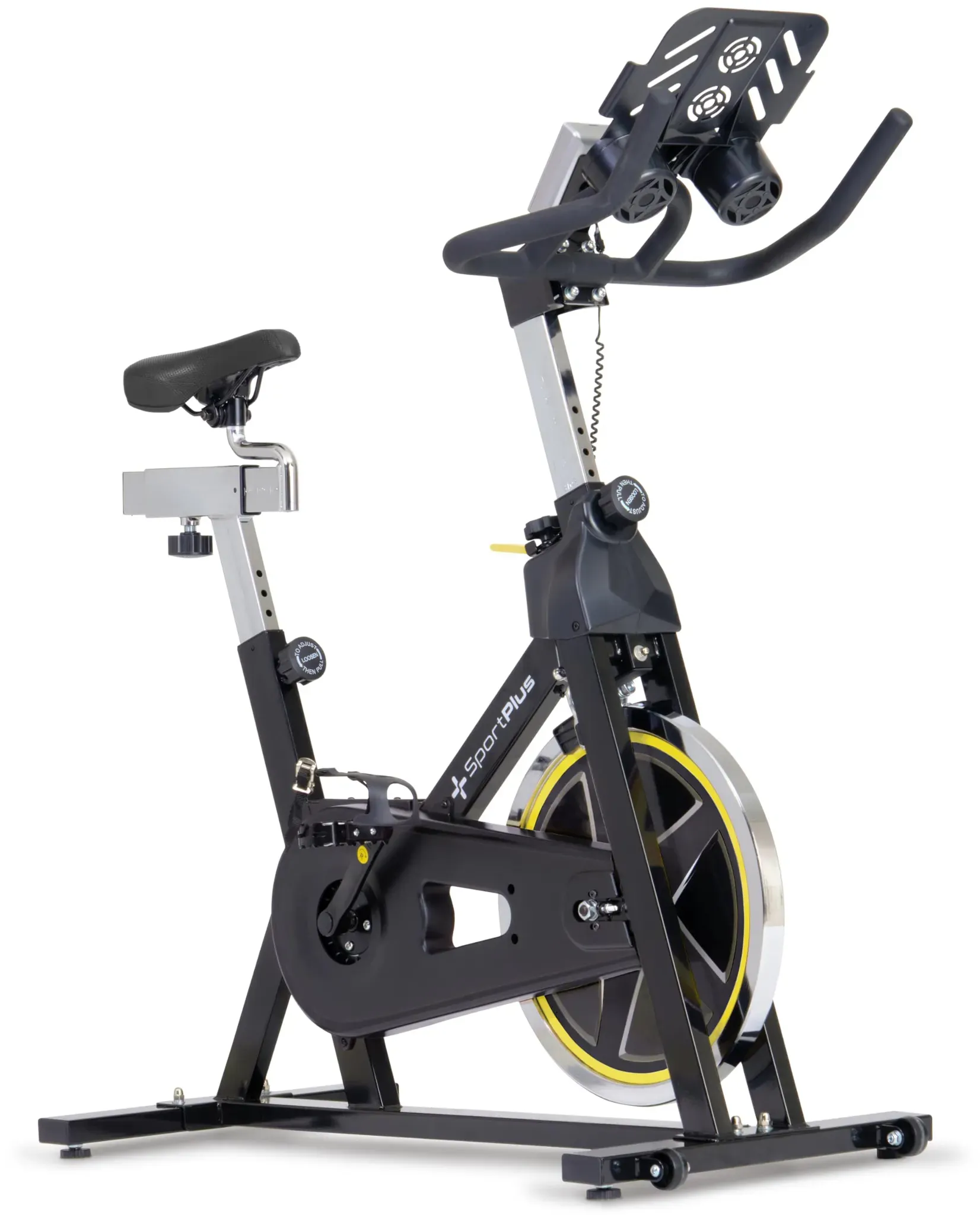 Kategorie: Heimtrainer - Sportplus - GTIN:4048268261074 - MODERNE TECHNOLOGIE Das Indoor Bike verfügt über ein Schwungrad von ca. 13 kg mit einem verschleißarmen & leisem Filz-Bremsbackensystem, Riemenantrieb und stufenloser & manueller Widerstandseinstellung. Das Speedbike für Einsteiger & Fortgeschrittene. TRAININGS DISPLAY Der Trainingscomputer des Fitnessbikes zeigt alle relevanten Daten für ein Intensives Training an (Zeit, Geschwindigkeit, Distanz, RPM, ca. Kalorienverbrauch und Puls) und verfüt über ein Zielwert Trainingsprogramm. ULTIMATIVES RACING FEELING Durch den Höhenverstellbarer Triathlonlenker und dem horizontal-, vertikal-, und neigungsverstellbarem Rennsattel genießt man echtes Radsport Feeling. Die Tablet- & Getränkehalterung bieten einem das zusätzliche PLUS beim Training QUALITäT DIE MAN SPüRT Die robuste Stahl-Rahmenkonstruktion und die Nivelierungshilfen sorgen für maximale Stabilität. Die Not-Stop Vorrichtung sorgt für zusätzliche Sicherheit. Durch die Transportrollen lässt sich das Speedbike platzsparend verstauen. Maximals Nutzergewicht: 150kg PULSKONTROLLE Mitells 5kHz-fähigen Brustgurt kann wärend des gesamten Trainings eine genaue und konstante Herzfrequenzmessung durchgefürt werden. So kann das Training optimal kontrolliert und gesteuert werden (nicht im Lieferumfang enthalten). DAS FüR DICH Seit 2 n produziert SportPlus hochwertige und langlebige Sportgeräte. Solltest du doch einmal eine Frage haben, kümmert sich unser Service in Hamburg gerne ... Ein solides Indoor Cycling Bike mit 22 kg Schwungmasse und Pulsmessung für ambitionierte Einsteiger. ![]() ![]() Miweba Sports Profi Indoor Cycling Bike MS400 | 22 Kg Schwungmasse - Traglast 150.0 Kg - Fitness Heimtrainer Fahrrad - Pulsmessung - Stufenfreie Widerstandsverstellung - Speedbike - Ergometer