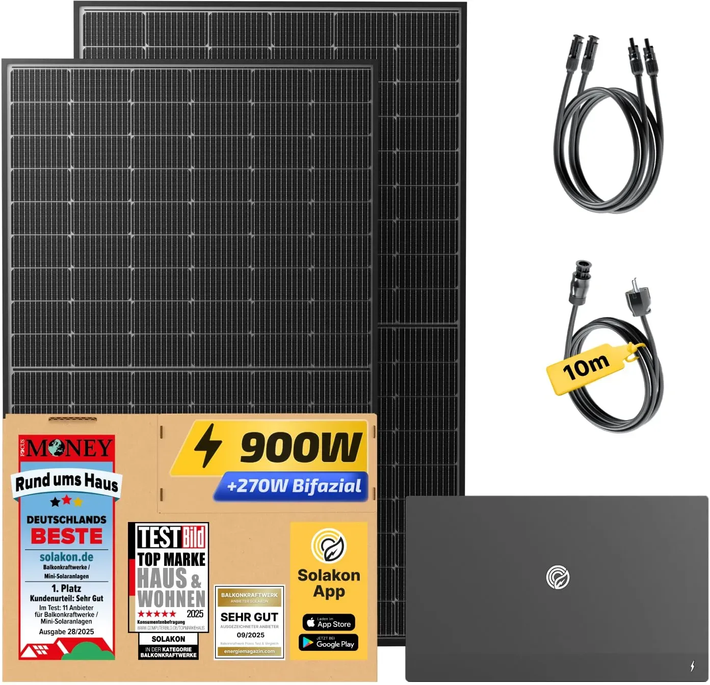 Kategorie: Solaranlagen - solakon - Premium Bauteile - Das 900W Balkonkraftwerk besteht nur aus hochwertigen Bauteilen. 2x bifaziale 450W TWMNH-48HD Solarmodule, 4x 3,0m DC-Verlängerungskabel, 1x 10m Kabel zur Steckdose, 1x Solakon ONE Balkonkraftwerk Speicher mit 2,11kWh und 800W Integrierten Hybrid-Wechselrichter. Kinderleichte Installation - Das Balkonkraftwerk kann ohne Elektriker oder Fachmann in ca. 1-2h aufgebaut werden. Profitieren Sie von 8.000 Ladezyklen und einem hohen Wirkungsgrad von 70%. Transparenz & Kontrolle per Solakon App - Mit der Solakon-App überwachen Sie Wechselrichter & Speicher Daten per WLAN-Funktion in Echtzeit. Sie sind direkt informiert über tägliche & jährliche Solarerträge & CO2-Einsparungen! Dank einfacher Einrichtung und intuitiver Bedienung direkt startklar! Höchste Server-Standards durch deutsche Eigenentwicklung! Inklusive 2,11 kWh speicher - Das Balkonkraftwerk mit Speicher macht die Energiegewinnung noch effektiver. Speichern Sie den erzeugten Strom in der Solakon ONE Solarbank zwischen und nutzen Sie diesen zu einem späteren Zeitpunkt. Mehr Stromertrag dank N-Typ*4 & bifazialer Module*2 - Unsere Premium-Module liefern auch bei diffusem Licht zuverlässig Energie und sichern Ihnen langfristig höhere Ersparnisse. - 1079,99 Euro bei Amazon Marketplace Home Improvement - gefunden von billiger.de Dieses 1000W Balkonkraftwerk mit 2,11 kWh Solakon ONE Speicher für 1119.99 Euro ist ein umfassendes Paket mit guter Speicherkapazität. ![]() ![]() Solakon® 1000W Balkonkraftwerk mit Speicher - Balkonkraftwerk 1000W komplett Steckdose - 800W Integrierten Hybrid-Wechselrichter - Solakon ONE mit 2,11 kWh - 2x 500W bifaziale Solarmodule