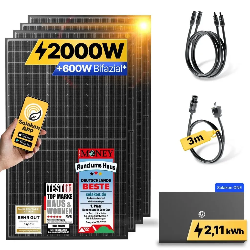 Zustand: Neu - Monokristalline Solarmodule - Solakon - SK-011133-S - EAN: 4262399772579 - ð—£ð—¿ð—²ð—ºð—¶ð˜‚ð—º ð—•ð—®ð˜‚ð˜ð—²ð—¶ð—¹ð—² - Das 1000W Balkonkraftwerk besteht nur aus hochwertigen Bauteilen. 2x bifaziale 500W Tongwei TWMNH54HD Solarmodule, 4x 3,0m DC-Verlängerungskabel, 1x 3m Kabel zur Steckdose, 1x Solakon ONE Balkonkraftwerk Speicher mit 2,11kWh und 800W Integrierten Hybrid-Wechselrichter. ð—žð—¶ð—»ð—±ð—²ð—¿ð—¹ð—²ð—¶ð—°ð—µð˜ð—² ð—œð—»ð˜€ð˜ð—®ð—¹ð—¹ð—®ð˜ð—¶ð—¼ð—» - Das Balkonkraftwerk kann ohne Elektriker oder Fachmann in ca. 1-2h aufgebaut werden. Profitieren Sie von 8.000 Ladezyklen und einem hohen Wirkungsgrad von 70%. ð—§ð—¿ð—®ð—»ð˜€ð—½ð—®ð—¿ð—²ð—»ð˜‡ & ð—žð—¼ð—»ð˜ð—¿ð—¼ð—¹ð—¹ð—² ð—½ð—²ð—¿ ð—¦ð—¼ð—¹ð—®ð—¸ð—¼ð—» ð—”ð—½ð—½ - Mit der Solakon-App überwachen Sie Wechselrichter & Speicher Daten per WLAN-Funktion in Echtzeit. Sie sind direkt informiert über tägliche & jährliche Solarerträge & CO‚‚-Einsparungen! Dank einfacher Einrichtung und intuitiver Bedienung direkt startklar! Höchste Server-Standards durch deutsche Eigenentwicklung! ð—œð—»ð—¸ð—¹ð˜‚ð˜€ð—¶ð˜ƒð—² ðŸ®,ðŸðŸ ð—¸ð—ªð—µ ð˜€ð—½ð—²ð—¶ð—°ð—µð—²ð—¿ - Das Balkonkraftwerk mit Speicher macht die Energiegewinnung noch effektiver. Speichern Sie den erzeugten Strom in der Solakon ONE Solarbank zwischen und nutzen Sie diesen zu einem späteren Zeitpunkt. ð— ð—²ð—µð—¿ ... Dieses 2000W/800W Solaranlage mit 3m Kabellänge für 1169 Euro ist eine leistungsstarke Option für Nutzer mit höherem Energiebedarf. Marktkauf. de Balkonkraftwerk 2000W/800W Solaranlage mit Solakon ONE Speicher Steckerfertig WIFI Komplettset Photovoltaik Anlage 800W, Kabellänge: 3m