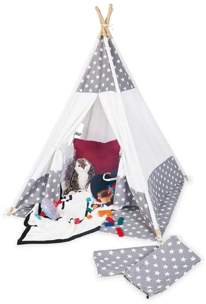 Spielzeug Holzspielzeuge Sonstige - Großer Spielspaß im Kinderzimmer Robuste Stangen aus massivem Kiefernholz Zeltstoff aus strapazierfähiger Baumwolle Fixierbare Tür mit Klettband Einfacher Aufbau Altersempfehlung: ab n Material 100 % Baumwolle Kiefer, Kunststoff Maße Aufgebaut: ca. B 110 x H 162 x T 110 cm Gewicht ca. 2.950 g Warnhinweise Achtung! Nur für den Hausgebrauch. Achtung! Von Feuer fernhalten. Achtung! Die Montage sollte nur von Erwachsenen durchgeführt werden. Achtung! Nicht für Kinder unter 18 Monaten geeignet. Lange Schnur/Lange Kette. Strangulationsgefahr. - gefunden von Kelkoo Dieses Tipi-Zelt mit naturbelassenem Holzgestänge kann individuell bemalt werden und fördert die Kreativität. ![]() ![]() Playfun Play Fun Tipi-Zelt / Kinderspielzelt, mit naturbelassenem Holzgestänge und individuell bemalbar bunt