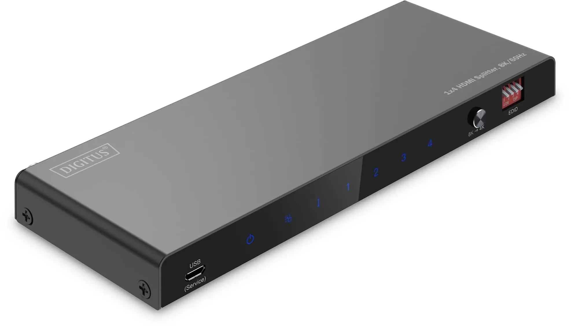 Auf Lager Versand durch AmazonDIGITUS DS-55340 HDMI Splitter 1x4 ? Eingang: 1-Port Ausgang: 4-Port ? UHD 8K 60 Hz HDTV: 7680 × 4320p ? HDCP 2.3 & HDMI 2.1 ? HDR, Deep Color, EDID-Umschalter ? Toslink, Stereo (3,5 mm)