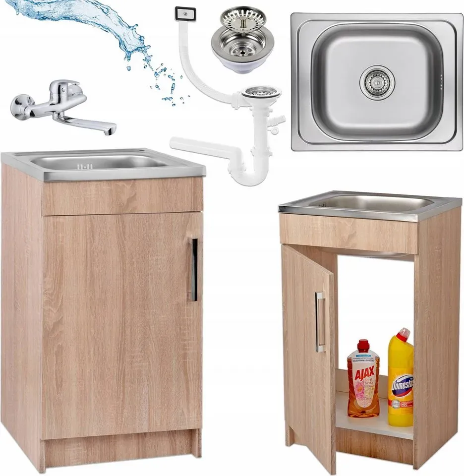 lieferbar-in 2-3 Werktagen bei dirSTAMAR Spülenschrank Küchenschrank 50cm Sonoma Spüle 50x40 Wandarmatur Chrom Komplett Set Standschrank 40cm Tiefe Siphon Geschirrspüler Platzsparend Kompakt braun