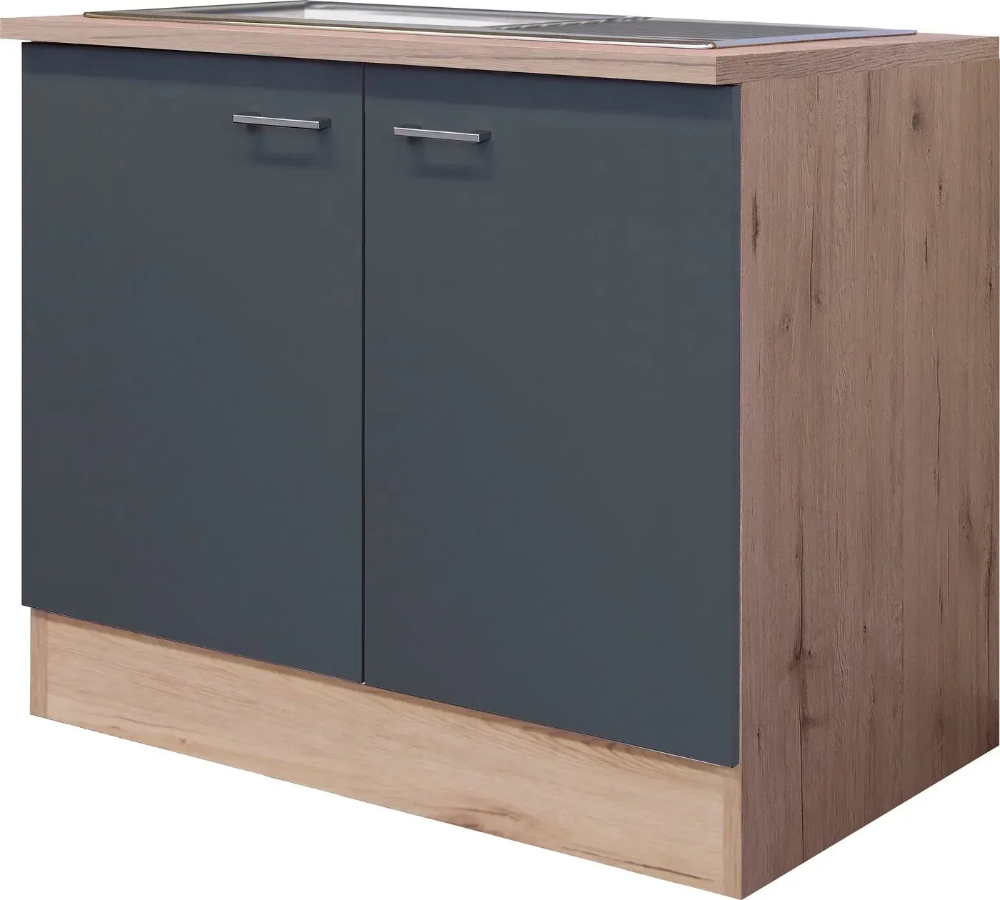 Spülen -Unterschränke Wohnen Küchen - - Farbe: Farbe: Basaltgrau / San Remo Eiche, Farbe Korpus: San Remo Eiche, Farbe Türen: Basaltgrau, Farbe Arbeitsplatte: San Remo Eiche, Farbe Griffe: Alu-Optik, Farbe Innendekor: Weiß, Farbhinweise: Bitte beachten Sie, dass bei Online-Bildern der Artikel die Farben auf dem heimischen Monitor von den Originalfarbtönen abweichen können., Ausstattung Funktionen: Anzahl Türen: 2 St., Anzahl Griffe: 2 St., Art Griffe: Bügelgriff, Maßangaben: Breite: 100 cm, Tiefe: 60 cm, Höhe: 85 cm, Stärke Korpuswände: 1,6 cm, Breite Arbeitsplatte: 100 cm, Tiefe Arbeitsplatte: 60 cm, Stärke Arbeitsplatte: 28 mm, Höhe Sockel: 13,6 cm, Hinweis Maßangaben: Alle Angaben sind ca.-Maße., Material: Material: Holzwerkstoff, Material Korpus: Holzwerkstoff, Material Türen: Holzwerkstoff, Material Griffe: Kunststoff, Material Beschläge: Metall, Material Rückwand: Hartfaserplatte, Material Scharniere: Metall, Optik/Stil: Oberflächenbeschichtung: melaminharzbeschichtet, Oberflächenoptik: seidenmatt, Oberflächenoptik Front: seidenmatt, Oberflächenoptik Korpus: seidenmatt, Lieferung Montage: Lieferumfang: Aufbauanleitung, Hinweis Lieferumfang: inkl. Edelstahl-Einbauspüle, Lieferzustand: zerlegt, Art Montage: stehend montierbar, Anzahl Packstücke: 2 St., Aufbauhinweise: einfache Selbstmontage mit Aufbauanleitung, Hinweise: Pflegehinweise: feucht abwischbar, Wissenswertes: Hersteller gemäß den -Bedingungen, Ergänzende Informationen: aussagefähige Montageanleitung ... Poco.de Flex-Well Spülenschrank Morena grau matt B/H/T: ca. 100x85x60 cm