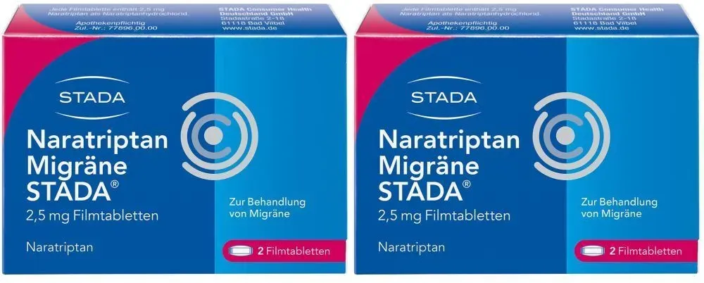 Kategorie: Arzneimittel - STADA - GTIN:4150093919188 - PZN:09391918 - Naratriptan Stada 2,5 mg Filmtabletten 6 St - 18,54 Euro bei medpex.de - gefunden von billiger.de DocMorris Apotheke hat eine 5x2 St. Packung für 18,99 Euro im Angebot, ideal für den langfristigen Bedarf. ![]() ![]() Naratriptan Migräne Stada 2,5mg 5x2 St. 2 St