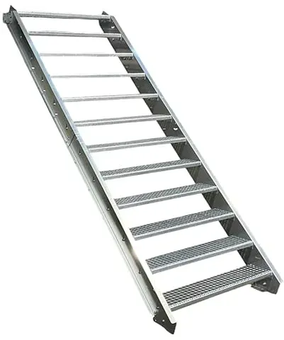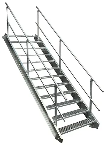 Kategorie: Treppen & Geländer - SRM Design - GTIN:4251504407994 - Srm-Design 12 Stufen Stahltreppe, Breite 80 cm, Geschosshöhe 180-240 cm, Robuste Außentreppe/Wangentreppe, Stabile Industrietreppe für den Außenbereich, Inklusive Zubehör, Silber, Feuerverzinkt - 1138,46 Euro bei Amazon Marketplace Home - gefunden von billiger.de Diese verzinkte Stahltreppe bietet eine gute Balance zwischen Preis und Qualität für den Außenbereich. ![]() ![]() Tailor Made Metal Stahltreppe verzinkt 12 Stufen Geschosshöhe 180-240cm / Stufenmaße 60 cm x 24 cm - Silber