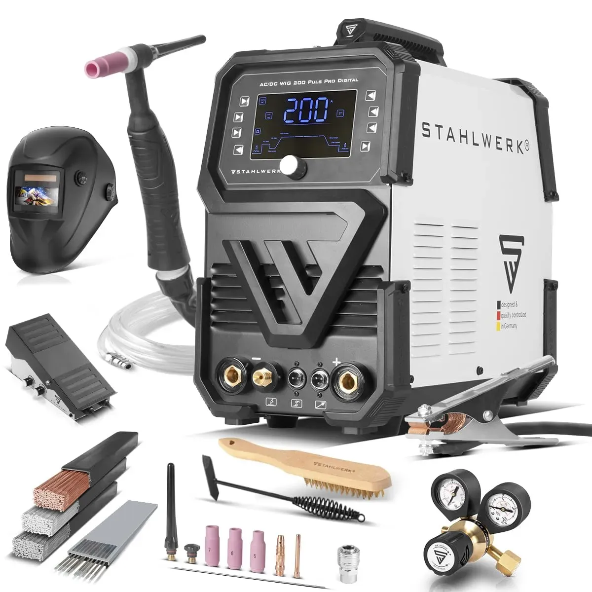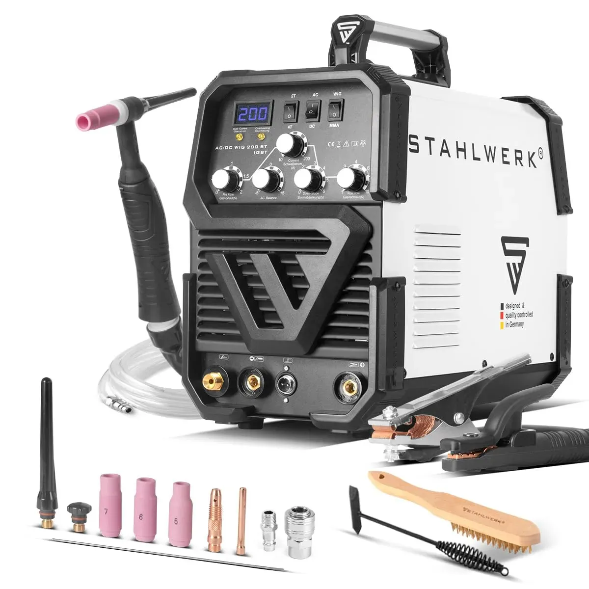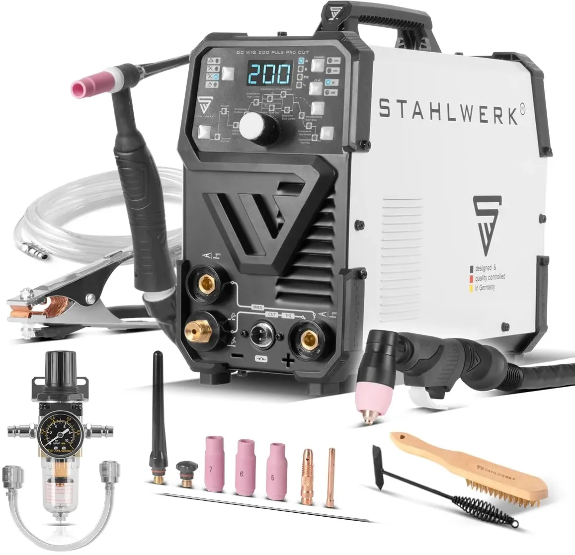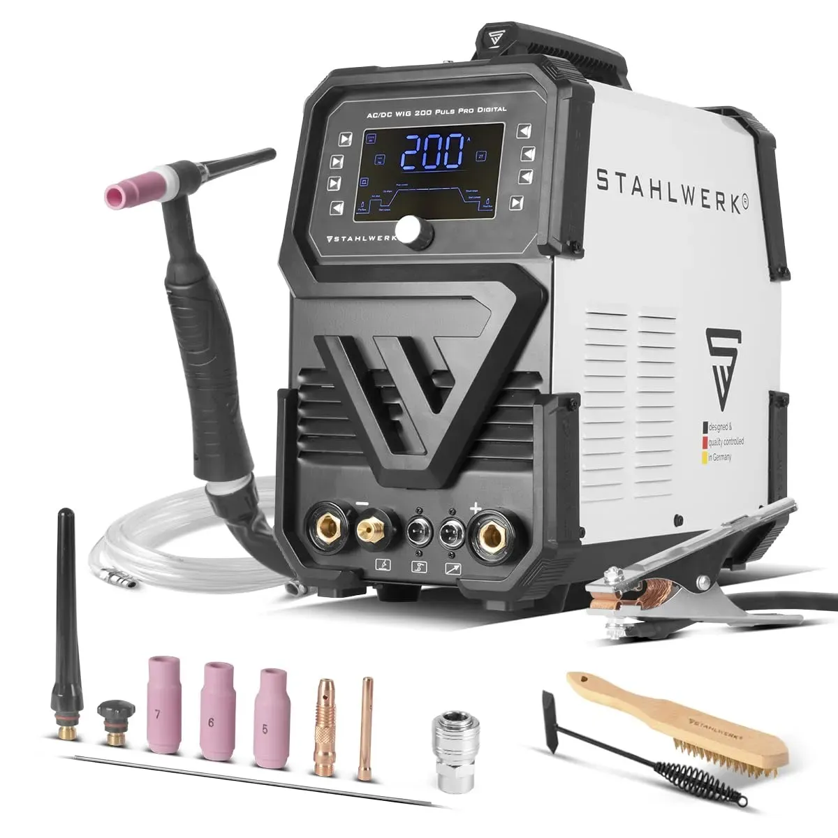 Verfügbarkeit: Auf Lager - Kategorie: Schweißgeräte - STAHLWERK - GTIN:4260294081178 - Präzises DC WIG-Schweißen €“ Gleichstrom (DC) für das professionelle Schweißen von Stahl, Edelstahl, Kupfer und weiteren Metallen. Ideal für Dünnbleche und feine Arbeiten. Hinweis: Nicht für Aluminium geeignet €“ hierfür wird ein AC/DC-Gerät benötigt. Leistungsstarkes 4-in-1 Kombigerät €“ WIG-Schweißen bis 200 A, MMA-Schweißen bis 160 A sowie integrierter 40 A Plasmaschneider. Fortschrittliche IGBT-Technologie sorgt für hohe Einschaltdauer und maximale Zuverlässigkeit. Umfangreiche Pulsfunktion für optimale Kontrolle €“ Die einstellbare WIG-Pulsfunktion verhindert Materialdurchbrennen und minimiert Hitzeverformungen. Perfekt für dünne Materialien dank konfigurierbarer Impulsstromstärke, Impulsfrequenz, Long- und Shortpuls. Produkte Testen, Probeschweißen, Probeschneiden vor Ort - überzeugen Sie sich selbst von unserer hohen Qualität & einzigartigem Kundenservice 7-Jahre- gemäß § 6 bedingungen, weitere Informationen: auf Verkäufernamen und dort auf Allgemeine Geschäftsbedingungen und Hilfe klicken - 299,99 Euro bei Amazon Marketplace Home Improvement - gefunden von billiger.de Dieses 2-in-1 Kombigerät für 349.99 Euro ist ideal für Aluminium und Stahl und bietet WIG- und MMA-Schweißen bis 200 A mit HF-Zündung und Smartkühlung. ![]() ![]() STAHLWERK Schweißgerät 2 in 1 Kombi AC/DC WIG 200 ST - WIG & MMA schweißen ist bis 200 A möglich, IGBT-Inverter, HF-Zündung, Smartkühlung, ideal für Aluminium & Stahl