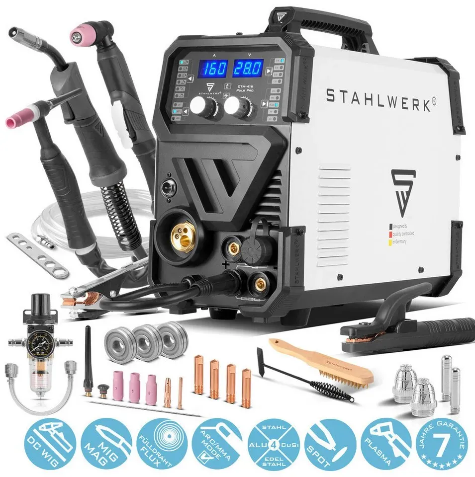 Verfügbarkeit: Auf Lager - Kategorie: Schweißgeräte - STAHLWERK - GTIN:4262452490693 - MIG/MAG-Schweißen inklusive Schweißhelm €“ flexibel mit Schutzgas: Metallschutzgasschweißen mit Gleichstrom (DC) €“ wahlweise mit inerten Gasen (MIG, z. B. Argon) oder aktiven Gasen (MAG, z. B. CO2). Gas- und Drahtzufuhr erfolgen gemeinsam über den Brennerkopf für effizientes, einhändiges Arbeiten. Intuitives Digital-Display €“ alle Parameter im Blick: Klares Digital-Display für eine einfache Kontrolle und Anpassung der Schweißparameter. Dank intuitiver Menüführung lassen sich Modi und Einstellungen schnell und präzise anwählen €“ ideal für Einsteiger und Profis. Synergischer Drahtvorschub €“ automatische Anpassung: Der Drahtvorschub passt sich automatisch dem eingestellten Schweißstrom an. Das sorgt für ein konstant optimales Schweißbild ohne manuelles Nachregeln €“ perfekte Ergebnisse bei jeder Anwendung. Produkte Testen, Probeschweißen, Probeschneiden vor Ort - überzeugen Sie sich selbst von unserer hohen Qualität & einzigartigem Kundenservice 7-Jahre- gemäß § 6 bedingungen, weitere Informationen: auf Verkäufernamen und dort auf Allgemeine Geschäftsbedingungen und Hilfe klicken - 552,99 Euro bei Amazon Marketplace Home Improvement - gefunden von billiger.de Dieses 6-in-1 Kombi-Schweißgerät für 649.99 Euro ist ein echtes Allround-Talent mit synergischem Drahtvorschub und 160 A Leistung. ![]() ![]() STAHLWERK Inverterschweißgerät Kombi-Schweißgerät CTM-416 Puls Pro 6-in-1 Schutzgas, 20 - 160 A, Packung}, 21-tlg., Einzelgerät, Schweißgerät, Inverter mit 160A, synergischem Drahtvorschub weiß