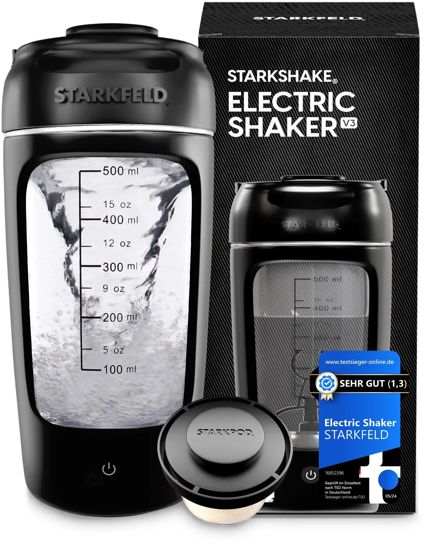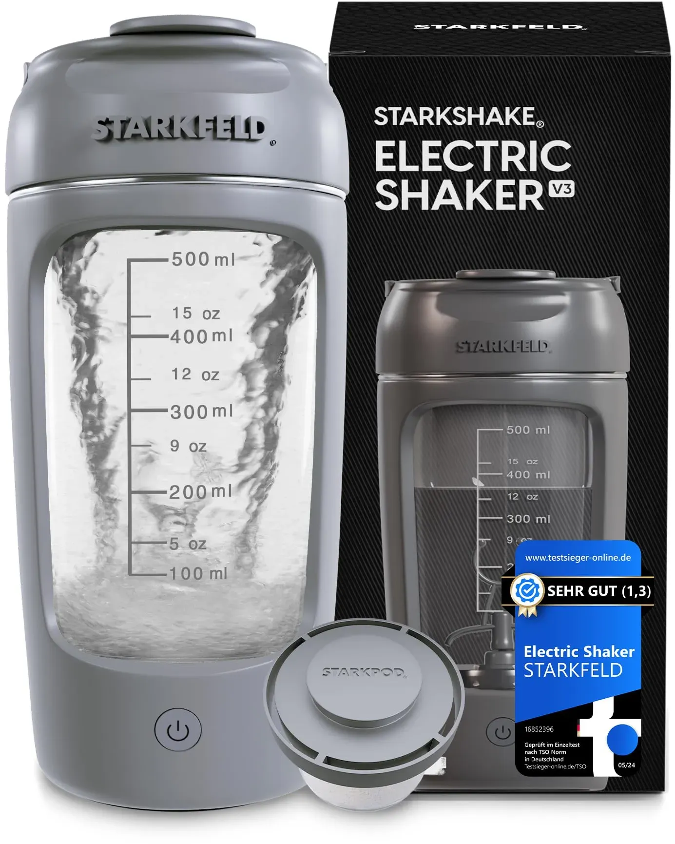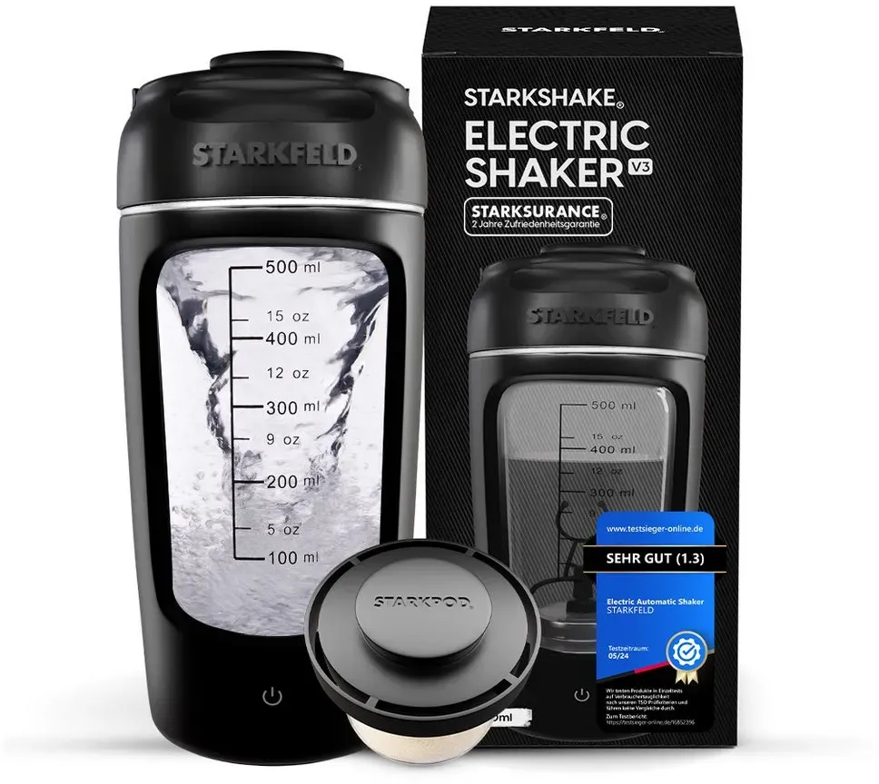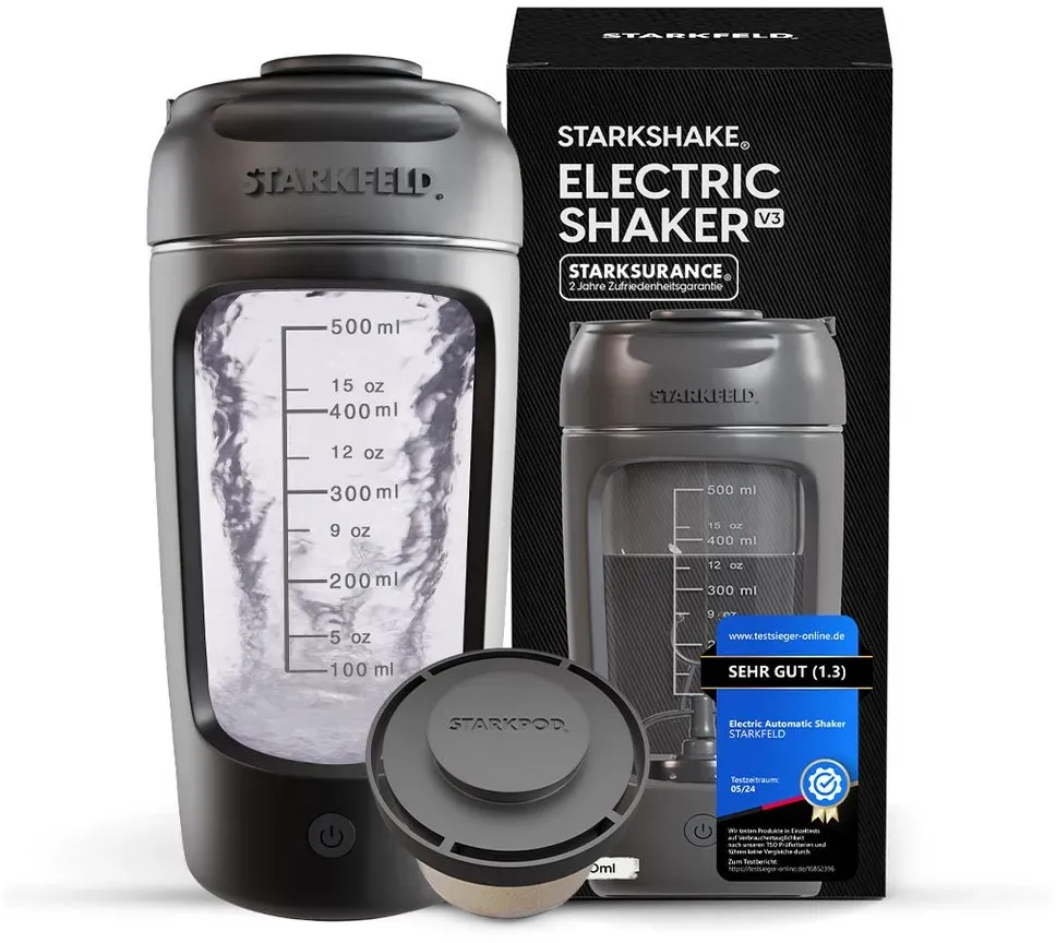 Kategorie: Sonstige Küchenhelfer - starkfeld - Die SHAKER-REVOLUTION beginnt hier: Der STARKSHAKE V3 ist der letzte Shaker Elektrisch, den du jemals brauchst! Mixe perfekte Eiweißshakes und Proteinshakes in nur 15 Sekunden klumpenfrei, leise und mühelos. STARKPOD REDESIGNED: Deine All-in-One-Lösung: Mixen und trinken in einem Gerät! Der innovative STARKPOD hält bis zu 60g Proteinpulver oder Supplements bereit ideal für deinen MetaFlow Shake , Holy Shaker oder Designer Whey unterwegs. Das beste daran ? Selbst mit eingesetztem Supplementpod, kannst du den STARKSHAKE immrnoch als Trinkflasche verwenden. GERMAN ENGINEERING : Aus BPA-freiem Tritan gefertigt, ist der STARKSHAKE robust, nachhaltig und langlebig. Dein perfekter Milchshaker für Alltag und Fitness und ein tolles Fitness Geschenk für Männer und Frauen das begeistert. LEISTUNG, die hält, was sie verspricht: über 60 Shakes pro Ladung der leistungsstarke Akku mit USB-C macht s möglich. Sollte der STARKSHAKE doch mal leer sein, kannst du ihn ganz einfach in 10 Minuten für 10 weitere Shakes aufladen. Dein Shake Mixer Elektrisch ist immer einsatzbereit, egal ob im Gym, Büro oder auf Reisen. STARKSURANCE: Zufriedenheit ist unser Versprechen: Mit n und erstklassigem deutschen Kundenservice bist du immer auf der sicheren Seite. Der STARKSHAKE ist der letzte Shaker, den du je kaufen wirst. 110% or nothing ! Das gilt selbstverständlich auch beim letzten Shaker den du kaufen wirst. DESIGN, das begeistert: Es gibt einen Grund, ... ![]() ![]() starkfeld STARKSHAKE V3 ausgezeichnet als bester elektrischer Shaker vom F.A.Z.-Verlag (2025) | Elektrischer Protein Shaker für cremige Eiweiß Shakes | 7000 UPM | USB-C |60+ Shakes | inkl. STARKPOD | SCHWARZ