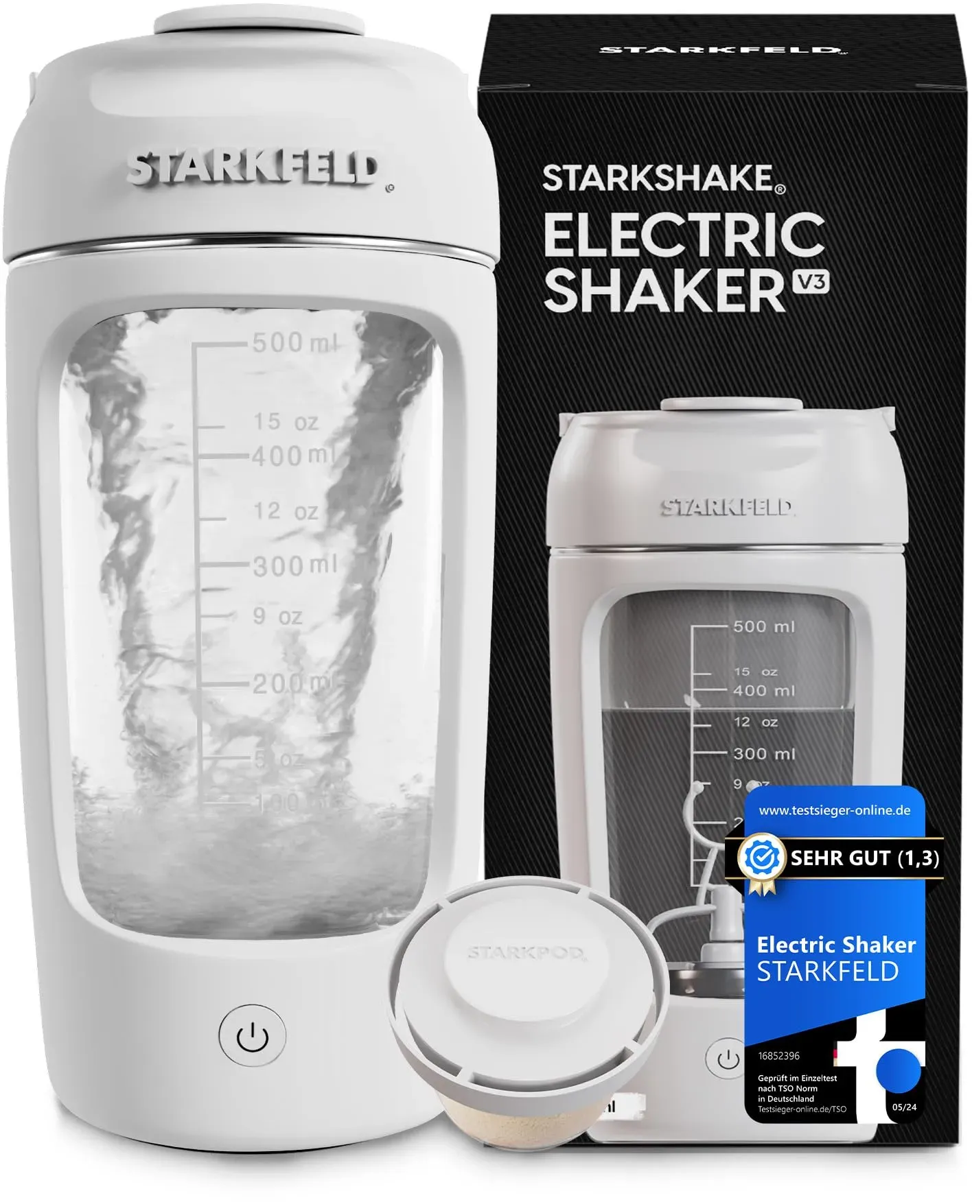 Kategorie: Sonstige Küchenhelfer - starkfeld - Die SHAKER-REVOLUTION beginnt hier: Der STARKSHAKE V3 ist der letzte Shaker Elektrisch, den du jemals brauchst! Mixe perfekte Eiweißshakes und Proteinshakes in nur 15 Sekunden klumpenfrei, leise und mühelos. STARKPOD REDESIGNED: Deine All-in-One-Lösung: Mixen und trinken in einem Gerät! Der innovative STARKPOD hält bis zu 60g Proteinpulver oder Supplements bereit ideal für deinen MetaFlow Shake , Holy Shaker oder Designer Whey unterwegs. Das beste daran ? Selbst mit eingesetztem Supplementpod, kannst du den STARKSHAKE immrnoch als Trinkflasche verwenden. GERMAN ENGINEERING : Aus BPA-freiem Tritan gefertigt, ist der STARKSHAKE robust, nachhaltig und langlebig. Dein perfekter Milchshaker für Alltag und Fitness und ein tolles Fitness Geschenk für Männer und Frauen das begeistert. LEISTUNG, die hält, was sie verspricht: über 60 Shakes pro Ladung der leistungsstarke Akku mit USB-C macht s möglich. Sollte der STARKSHAKE doch mal leer sein, kannst du ihn ganz einfach in 10 Minuten für 10 weitere Shakes aufladen. Dein Shake Mixer Elektrisch ist immer einsatzbereit, egal ob im Gym, Büro oder auf Reisen. STARKSURANCE: Zufriedenheit ist unser Versprechen: Mit n und erstklassigem deutschen Kundenservice bist du immer auf der sicheren Seite. Der STARKSHAKE ist der letzte Shaker, den du je kaufen wirst. 110% or nothing ! Das gilt selbstverständlich auch beim letzten Shaker den du kaufen wirst. DESIGN, das begeistert: Es gibt einen Grund, ... ![]() ![]() starkfeld STARKSHAKE V3 ausgezeichnet als bester elektrischer Shaker vom F.A.Z.-Verlag (2025) | Elektrischer Protein Shaker für cremige Eiweiß Shakes | 7000 UPM | USB-C | 60+ Shakes | inkl. STARKPOD | WEIß