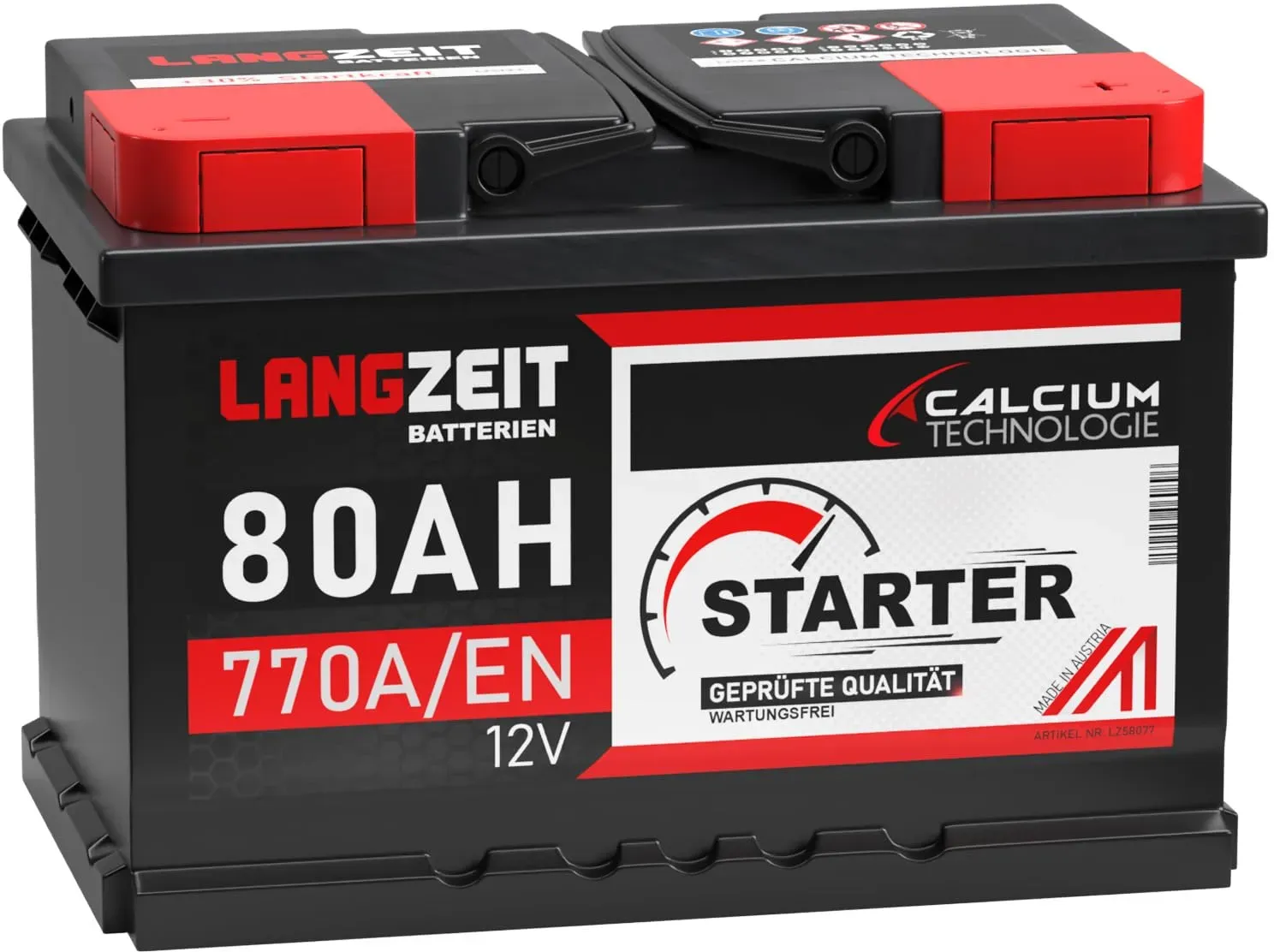 Verfügbarkeit: Auf Lager - Kategorie: Autobatterien - LANGZEIT Batterien - GTIN:4260713243019 - Autobatterie 80Ah 12V 770A/EN - LANGZEIT STARTER: Qualität made in Austria! Eine Autobatterie der Premiumklasse mit modernster CALCIUM-CALCIUM Technologie für mehr Startkraft, Langlebigkeit und Zuverlässigkeit im Einsatz. Die Batterien erfüllen die hohen Anforderungen der Erstausrüstung, sind wartungsfrei und überzeugen mit Ihren Qualitäten auf der ganzen Linie. KONSTANT HOHE STARTKRAFT: Die Autobatterien von LANGZEIT bringen 30% mehr Startleistung gegenüber herkömmlichen Starterbatterien und weisen hohe Kapazitätsreserven sowie ausgezeichnete Kaltstartleistungen bei jeder Wetterlage auf. Die Startkraft ist über die gesamte Lebensdauer konstant hoch und zu jederzeit Jahreszeit gegeben. HOHE ENERGIEKAPAZITäT UND ENORMER ENERGIEDURCHSATZ werden dank korrosionsresistenter CALCIUM-CALCIUM Legierung der Gitter und verstärktem Plattenaufbau möglich. Dadurch ist die Autobatterie optimal für Fahrzeuge mit einem höheren Leistungsanspruch geeignet und bewährt sich auch auf Kurzstrecken und in Dieselfahrzeugen. Außerdem zeigt die Autobatterie eine deutlich bessere Stromaufnahme und lässt sich so viel schneller aufladen. ABSOLUT WARTUNGSFREI: Dank moderner Technologie sind die Autobatterien der Langzeit STARTER Serie wartungsfrei. Mit Hilfe des Kondenswasser-Rückgewinnungssystems wird das Kondensat sicher und verlustfrei in den Plattenblock zurückgeleitet, was einen ... Diese LANGZEIT Autobatterie mit 77Ah bietet eine gute Balance aus Kapazität und Preis und ist eine beliebte Wahl. ![]() ![]() LANGZEIT Batterien LANGZEIT Autobatterie 12V 77AH 720A/EN Starterbatterie +30% mehr Leistung ersetzt Batterie 74 Ah 70Ah 72Ah 75Ah