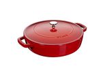 Staub - EAN: 3272340019807 - Mit dem Multifunktionsbräter von Staub bieten sich Ihnen zahlreiche Möglichkeiten der Zubereitung wohlschmeckender Fleisch-, Gemüse- und Fischgerichte. Dank der Materialeigenschaften des aus emailliertem Gusseisen gefertigten Bräters müssen Sie beim Kochen nur vergleichsweise wenig öl zugeben und servieren Ihrer Familie und Ihren Gästen deshalb gleichermaßen leichte wie gesunde Speisen. Zwei Griffe ermöglichen Ihnen den sicheren Transport des Bräters, den Sie auf allen Herdarten auch Induktion nutzen können. Der Multifunktionsbräter ist mit der Chistera Drop-Structure ausgestattet. Das heißt, im Deckel befindet sich ein Tropfenmuster, welches das Kondenswasser auf Ihr Bratgut herabregnen lässt. Das gleichmäßig befeuchtete Fleisch oder Gemüse bleibt zart und schmeckt besonders aromatisch. Das spezielle Design verwirklicht ein solches Selbstbefeuchtungssystem erstmals in einem gewölbten Deckel, wodurch Ihnen viel Volumen geboten wird. Der runde Multifunktionsbräter ist 11,6 cm hoch, mit Griffen 31,7 cm breit, 24 cm breit und hat ein Fassungsvermögen von 2,4 l. Dank der ansprechenden kirschroten Farbe setzt der Bräter einen leuchtenden Farbakzent in Ihrer Küche und kann auch zum stilvollen Servieren der Speisen genutzt werden. Mit dem Multifunktionsbräter aus der Serie Bräter von Staub profitieren Sie von einem einzigartigen Selbstbefeuchtungssystem und ergänzen Ihr Kochgeschirr um einen attraktiven Blickfang. Ideal zum Anbraten und langsamen ... ![]() ![]()