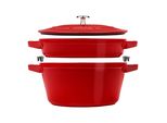 Staub - EAN: 3272340054440 - Wenn es um gusseisernes Kochgeschirr geht, sind zwei wesentliche Artikel die Grundlage einer gut ausgestatteten Küche: eine gusseiserne Pfanne oder Bratpfanne und eine Cocotte oder ein Dutch Oven. Zusammen decken sie fast alle kulinarischen Bedürfnisse ab. Und mit der neuen stapelbaren Edition von STAUB können Sie sie bei Nichtgebrauch ordentlich stapeln, so dass sie möglichst wenig Stauraum beanspruchen und trotzdem gut aussehen. Dieses Set aus schwarzem Gusseisen besteht aus einer Cocotte, einer Pfanne und einem Deckel mit einem Durchmesser von jeweils 24 cm. Im Lieferumfang enthalten ist ein Set von Randschützern, die zur Aufbewahrung zwischen Pfanne und Cocotte gelegt und vor dem Kochen entfernt werden müssen. Mit ihrem hochwertigen emaillierten Material verbinden sie die hervorragenden Kocheigenschaften und die Haltbarkeit von Gusseisen mit der Benutzerfreundlichkeit und Schönheit von emailliertem Kochgeschirr. Die Gusseisenpfanne eignet sich perfekt zum Braten von Fleisch oder Fisch, zum Beispiel für Lachs-Caprese, während die Cocotte zum Kochen von Pasta oder einer Tomatensuppe für ein italienisches Menü verwendet werden kann. Natürlich kann die Cocotte auch im Backofen für die klassischen Schmorgerichte verwendet werden. 2-teiliges Set mit Cocotte, Pfanne und Deckel. 24 cm Durchmesser. Inklusive Randschützer für eine sichere Aufbewahrung. Hochwertiges emailliertes Gusseisen. Geeignet für alle Herdplatten, einschließlich Induktion - bei ... Ein attraktives 2-teiliges Set in Weiß, das eine stilvolle Ergänzung für jede Küche darstellt. ![]() ![]() Staub Cocotte Kochtopfset 2-tlg. weiß