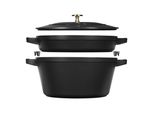 Staub - EAN: 3272340054556 - Mit einer gusseisernen Cocotte und Pfanne ist man für die meisten kulinarischen Abenteuer gut gerüstet. Und mit dem neuen stapelbaren Set von STAUB passen sie auch in eine kleine Küche. Das Set enthält einen dicht schließenden Deckel und zwei Randschützer, so dass sich die Töpfe sicher stapeln und leicht voneinander trennen lassen. Das Kochgeschirr besteht aus hochwertigem emailliertem Gusseisen, das alle Vorteile von Gusseisen - optimale Wärmeverteilung, hohe Lebensdauer, natürliches Material - mit der einfachen Handhabung der emaillierten Oberfläche verbindet. Es ist kein Nachwürzen erforderlich und die Emaille ist zudem kratzfest. Das Kirschrot auf der Außenseite wird mit einer schwarzen, matten Emaille auf der Innenseite kombiniert, die Tausende von Mikro-Röstpunkten bietet, die den Geschmack der Speisen verstärken, während die kleinen Spalten in der unebenen Oberfläche die Säfte auffangen und eine köstliche Sauce ergeben. Die Cocotte ist ideal für die Zubereitung von Gerichten, die zuerst angebraten und dann in den Ofen geschoben werden müssen, während die Pfanne oder die Bratpfanne zum Braten von Fleisch, Fisch oder Gemüse geeignet ist. Dieses Set ist auch ein perfektes Geschenk für eine Hochzeit, bei der die leuchtende Kirschfarbe als Symbol für Liebe und Leidenschaft gilt, nicht zuletzt für die köstlichen Speisen, die darin zubereitet werden. 2-teiliges Set mit Cocotte, Pfanne und Deckel. 24 cm Durchmesser. Inklusive Randschützer für ... Ein solides 2-teiliges Set in Schwarz, das eine gute Basis für die tägliche Kochpraxis bietet. kaufland.d e Staub Kochtopfset, 2-tlg rund Gusseisen Schwarz