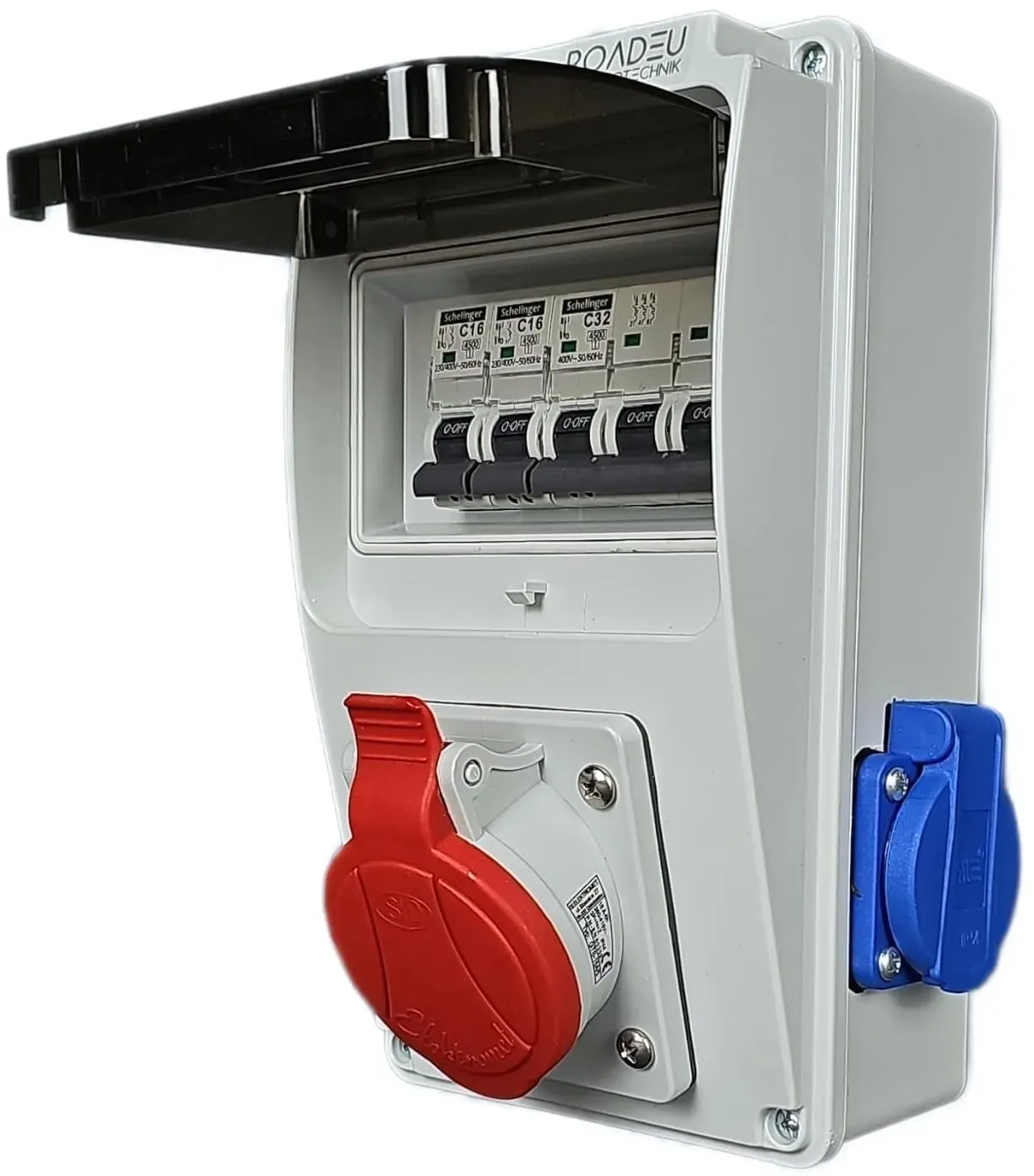 Verfügbarkeit: Auf Lager - Kategorie: Sonstige Elektroinstallationsartikel - RoadEu - GTIN:5904121801797 - ANSCHLUSSFERTIG VORVERDRAHTETER STROMVERTEILER: Der Stromverteiler ist bereits vorverdrahtet und anschlussfertig, sodass eine einfache und schnelle Installation gewährleistet ist. FLEXIBLER EINSATZ IM INNEN- UND AUSSENBEREICH: Der Verteiler ist für den Innen- und Außenbereich konzipiert und minimiert den Installationsaufwand durch nur eine Zuleitung, weniger Bohrlöcher und eine reduzierte Anzahl an Kabel- und Rohrschellen. VIELSEITIGE BESTüCKUNG: Der Verteiler ist mit 1x 16A 5P 400V IP44 Dose und 2x 230V 16A IP44 Schuko-Dosen ausgestattet, um eine breite Palette von Anwendungen und Geräten abzudecken. ZUVERLäSSIGE ABSICHERUNG: Der Verteiler ist mit 1x LS Leitungsschutzschalter C16A 3P und 2x LS C16A 6kA 1P abgesichert. Alle Schalter verfügen über Herstellerzertifikate von TüV, was höchste Sicherheitsstandards gewährleistet. ZUFRIEDENHEITS Wir sind von der Qualität dieses Produkts überzeugt und hoffen, dass Sie zufrieden sind. Sollten Sie dennoch unzufrieden sein, können Sie es einfach zurücksenden und wir erstatten Ihnen den vollen Kaufpreis. Unser Ziel ist es, Ihnen ein erstklassiges Produkt und einen hervorragenden Kundenservice zu bieten. - 54,99 Euro bei Amazon Marketplace Automotive - gefunden von billiger.de Ein robuster Baustromverteiler mit 32A CEE-Steckdose und 2 Schuko-Steckdosen, perfekt für den professionellen Einsatz und hohe Leistungsanforderungen. ![]() ![]() RoadEu Stromverteiler 32A 5P Steckdose - 2x 230V Schuko - Baustromverteiler 32A mit Sicherungsautomat - CEE Verteiler - Stromverteiler Aussen Wasserdicht IP44