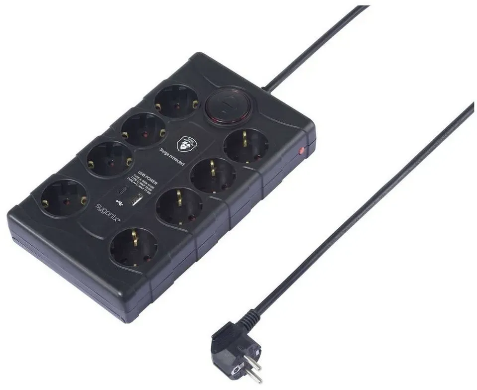 lieferbar-in 2-3 Werktagen bei dirSygonix 8-fach überspannungs-Steckdosenleiste, 2x USB SY-4751202 Steckdosenleiste, mit Schalter, mit USB, mit USB-C , überspannungsschutz