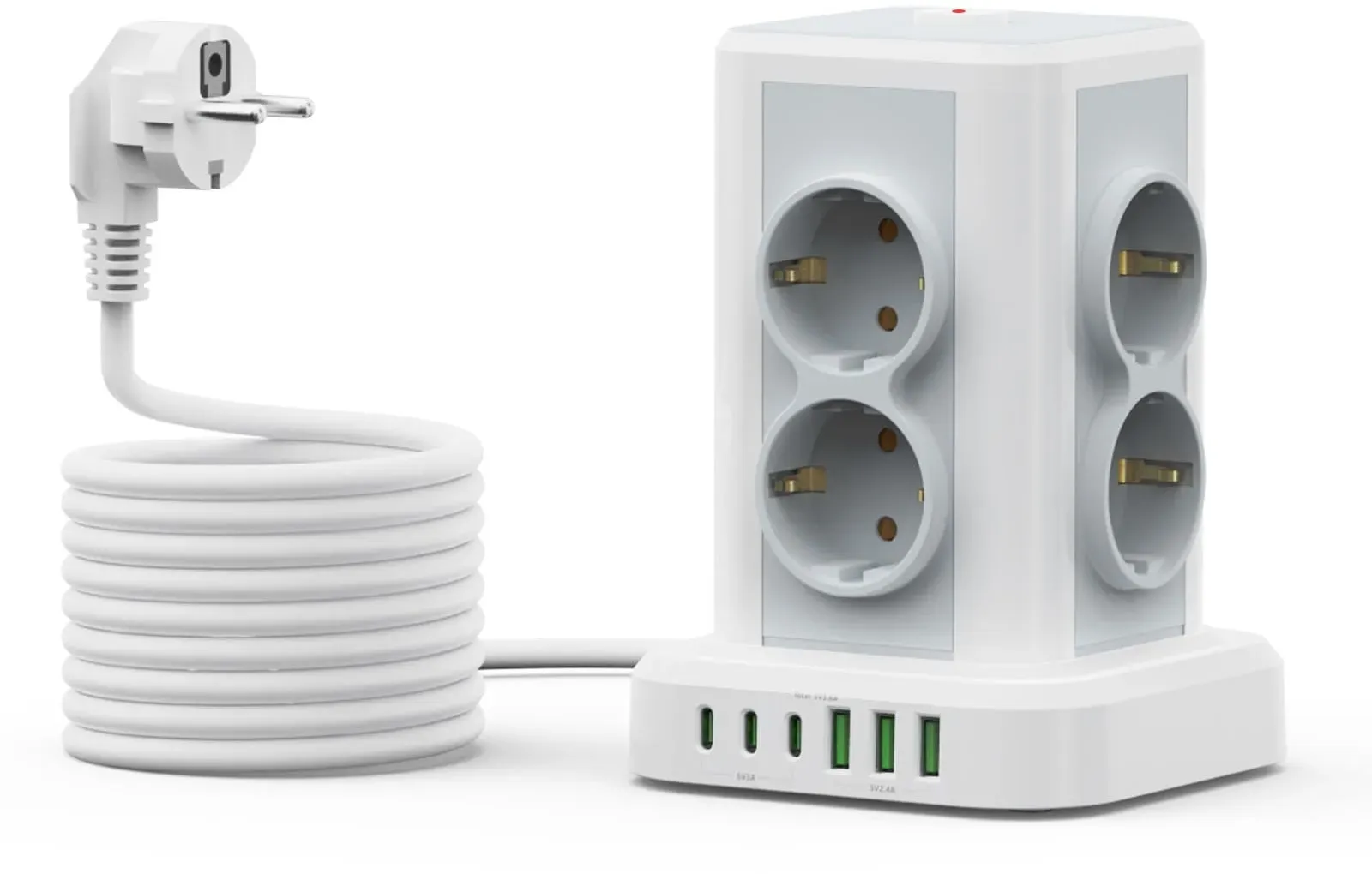 lieferbar-in 2-3 Werktagen bei direchos Eco-4135 Steckdosenleiste 8-fach (Ein- / Ausschalter, Kontrollleuchte, 2 x USB-A Anschlüsse, 2x 2 USB-C Anschlüsse, Kindersicherung, überspannungsschutz, überstromschutz, Feuerfestes Material, Kabellänge 3 m), 12-in-1 Steckdosenturm, 3 Meter Stromkabel, USB-A und USB Typ-C weiß