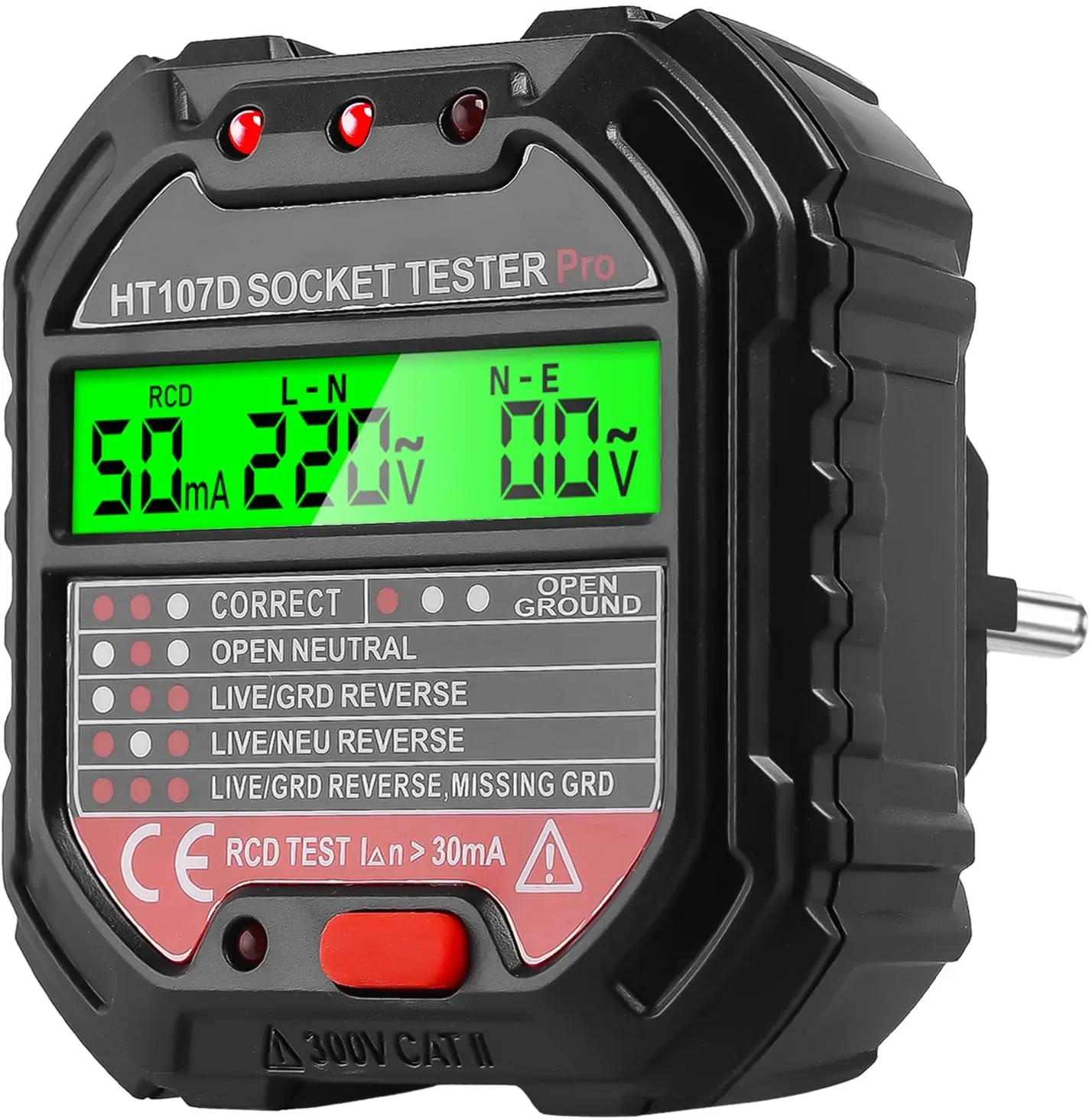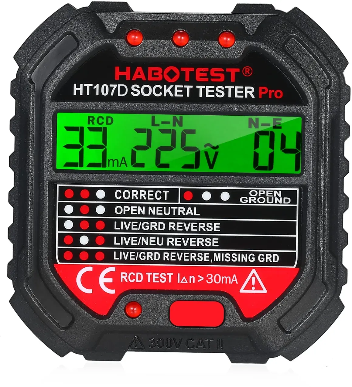 Kategorie: Spannungsprüfer - minshuxi - GTIN:0765123383460 - LCD-Display: Das Steckdosenprüfgerät ist mit einem farbigen LCD-Display ausgestattet, das deutlich anzeigt, ob die Steckdose richtig verdrahtet ist, und Ihnen hilft, die Spannungsmessung leicht abzulesen. ONE KEY TEST: Drücken Sie die Testtaste, um zu überprüfen, ob der Auslöseschalter funktioniert, drücken Sie RCD TEST für 1 Sekunde, dann überprüfen Sie, ob der MCB ausgelöst wird, wenn es ausgelöst wird, bedeutet dies, dass der RCD normal ist, sonst bitten Sie bitte den Techniker, es zu überprüfen. üBERPRüFUNG DER ELEKTRISCHEN PROBLEME: Wenn es ein Problem mit der Verkabelung gibt, wird der Bildschirm sofort orangefarben angezeigt. Drei Anzeigeleuchten warnen Sie vor sechs möglichen Leitungsfehlern: 1. Unterbrechung der Erdung; 2. Unterbrechung des Neutralleiters; 3. Unterbrechung der Phasen; 4. Verwechslung von Phase und Erde; 5. LEITUNGSPRüFUNG: Der kompakte und leichte Steckdosentester kann Leitungsfehler wie offene Erde, offener Nullleiter, offene Phase, doppelte öffnung (Nullleiter und Erde), Umkehrung von Phase und Erde und Umkehrung von Phase und Nullleiter erkennen. Einfach zu bedienen: Plug-and-Play-Design. Selbst Laien können mit dem Steckdosenprüfgerät schnell und präzise den Spannungs- und Verdrahtungszustand prüfen, FI-Schutzschalter aktiv testen und Leckspannung und -strom aufspüren. Schützt Sie perfekt vor der Gefahr eines Stromschlags! - 12,74 Euro bei Amazon Marketplace Automotive - gefunden von ... Dieser gomety Steckdosentester ist mit 12,89 Euro ein gutes Mittelklasse-Modell, das eine RCD-Prüfung, ein LCD-Voltage-Display und 6 Fehlerdiagnosearten bietet. ![]() ![]() gomety Steckdosentester mit RCD-Prüfung und LCD-Voltage-Display, Digitaler Socket Tester 6 Arten von Fehlerdiagnose, 10A Steckdosenprüfgerät mit Kontrollleuchten, FI Tester 90-250V/45-65Hz CAT ll 300V