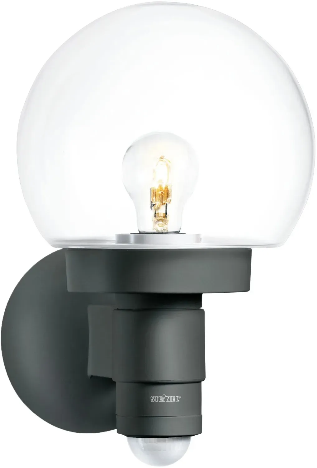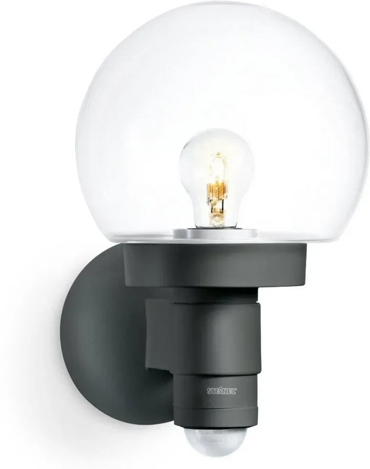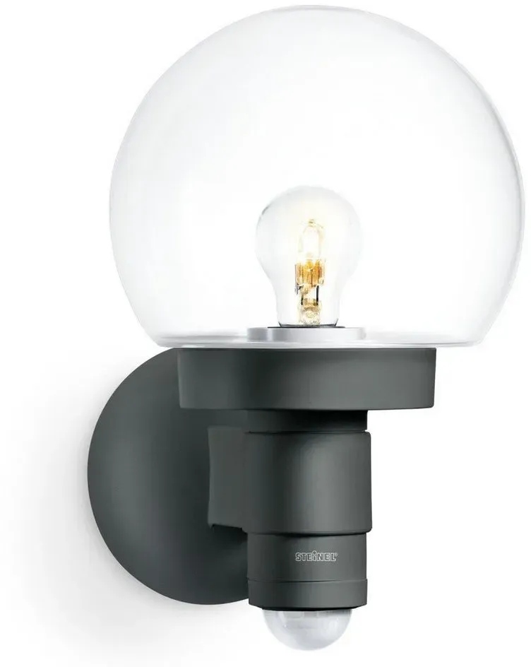 Steinel - EAN: 4007841059880 - Ansprechend gestaltete Außenwandleuchte L 115 S mit Bewegungsmelder Eine dekorative Möglichkeit, den Außenbereich z. B. im Bereich des Hauseingangs lichtvoll und damit auch sicherer zu gestalten, bietet die klassische Außenleuchte L 115 S. Ihr Gehäuse ist aus robustem Kunststoff gearbeitet, der fast kugelförmige Diffusor besteht aus klarem Glas. An der Leuchte ist ein Bewegungsmelder verbaut, der sicherstellt, dass das Licht sich nur dann einschaltet, wenn es auch benötigt wird. Durch die Transparenz des Glasschirms bleibt die eingesetzte Lampe sichtbar, weshalb es sich empfiehlt, ein dekoratives Filament-Leuchtmittel zu verwenden: nicht inklusive, über Zubehör bestellbar. Technische Daten des Bewegungsmelders: - Reichweite: max. 12 m - Erfassungswinkel: 240 - Montagehöhe: 2 m - Leuchtdauer 5 s bis 15 min einstellbar - Dauerlicht für 4 h einstellbar - Auslöseschwelle: 2 - 2.000 lx - mit Softlicht-Start - Montagehöhe: max. 6 m - bei lampenwelt.de - aus Yadore Produktdaten Dieses Angebot von edelstahl-tuerklingel.de bietet die anthrazitfarbene Sensor-Außenleuchte zu einem guten Preis. ![]() Steinel Außenleuchte L 115 S Anthrazit Sensor