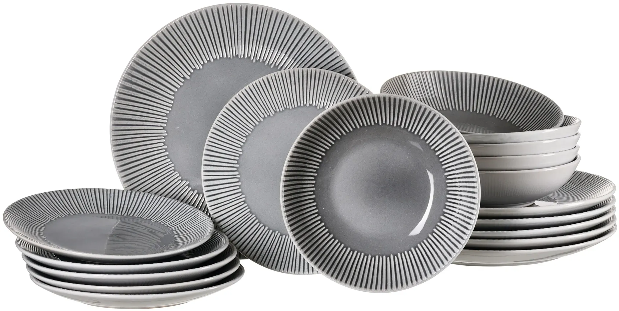 Kategorie: Services - MiaMio - GTIN:4260611273354 - MODERNES GESCHIRRSET Erleben Sie modernen Flair mit dem MIAMIO Steingut Geschirr Set. Das 18-teilige Essgeschirr Set für 6 Personen enthält 6 Schüsseln, 6 Frühstücksteller und 6 große Teller. Perfekt für Familien und besondere Anlässe, macht dieses robuste Keramik Speiseservice jede Mahlzeit zu einem besonderen Erlebnis. ZEITLOSES UND PRAKTISCHES DESIGN Inspiriert vom französischen Wort 'Papillon' (Schmetterling), besticht dieses Steinzeug Geschirrset durch seine farbenfrohe und elegante Optik. Das moderne Tafelgeschirr bringt Freude beim Servieren und lässt sich platzsparend stapeln. Dieses Geschirrset modern wird zum Blickfang auf jedem Esstisch. VIELSEITIG EINSETZBAR Das MIAMIO Keramik Geschirr Set ist ein wahrer Allrounder. Ob fürs morgendliche Müsli, das schnelle Mittagessen oder die große Feierlichkeit dieses Steingut Geschirrset ist für jeden Anlass ideal. Dank seiner Robustheit auch als Camping Geschirr Set oder Outdoor Geschirr geeignet. ROBUST UND PFLEGELEICHT Gefertigt aus hochwertigem Steingut, ist jedes Teil dieses modernen Kombiservice besonders robust und langlebig. Das Keramik Geschirrset ist spülmaschinen- und mikrowellenfest, was die Handhabung und Reinigung kinderleicht macht. Ideal für den Alltag und besondere Anlässe, ist dieses Steingut Geschirr Set eine praktische Ergänzung für jede Küche. GESCHENK FüR SIE/IHN Sorgfältig verpackt in einer schönen Geschenkbox, ist dieses Geschirrset für 6 Personen ... Ein klassisches 18-teiliges Tafelservice für 6 Personen von Ritzenhoff & Breker in Grau, das für seine Qualität bekannt ist. ![]() ![]() Ritzenhoff & Breker "Banda", grau, 18 Stk., Steingut, Geschirr-Sets, aus Steingut für 6 Personen