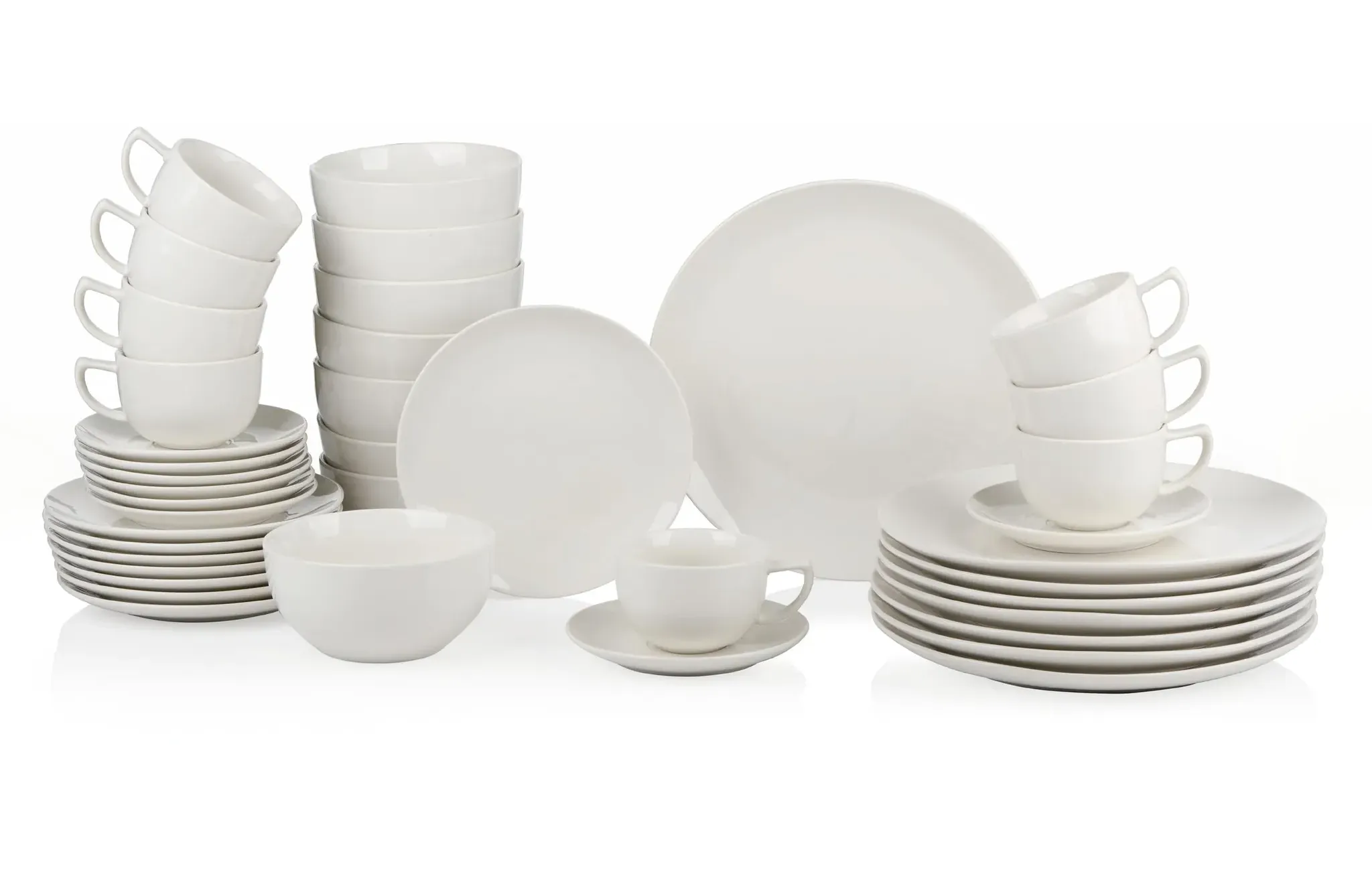 Kategorie: Services - PURE LIVING INTERIOR DESIGN - GTIN:8720364107352 - Scandi Design: Unser Geschirrset besticht durch ein elegantes Farbspiel und eine dezente Riffelstruktur,die Ihrem Tisch einen modernen und zugleich stilvollen Look verleiht. Die harmonisch abgestimmten Farben machen jede Mahlzeit zu einem Erlebnis. Langlebiges, Hochwertiges Steingut: Gefertigt aus robustem Steingut, bietet unser Geschirrset nicht nur eine lange Lebensdauer, sondern auch eine hohe Widerstandsfähigkeit gegen Kratzer. Es ist ideal für den täglichen Gebrauch. Alltagstauglich und Praktisch: Das Geschirrset ist spülmaschinenfest und mikrowellengeeignet, was die Handhabung im Alltag erleichtert und Zeit spart. Für schnelle Mahlzeiten unter der Woche oder ein gemütliches Dinner am Wochenende. Vollständig Ausgestattet für jede Mahlzeit: Mit 4 großen Tellern, 4 kleinen Tellern, 4 Schüsseln bietet unser Set alles, was Sie für ein stilvolles Essen mit bis zu 4 Personen benötigen. Beeindrucken Sie Ihre Gäste:Das zeitlose Design und die edlen Farben des Geschirrsets machen es zum Highlight auf jedem Esstisch. Elegante Details und hohe Funktionalität sorgen dafür,dass Ihre Tischdekoration einen bleibenden Eindruck hinterlässt. - 49,95 Euro bei Amazon Marketplace Home - gefunden von billiger.de Dieses umfangreiche 40-teilige Set für 8 Personen bietet ein hervorragendes Preis-Leistungs-Verhältnis und ist mikrowellen- und spülmaschinengeeignet. ![]() ![]() Alpina Geschirrset 8 Personen - 40-teiliges Steingut Geschirr - Teller Set mit Speiseteller, Schalen und Kaffeebecher - Camping Geschirr - Mikrowelle- und Spülmaschinengeeignet - Weiß