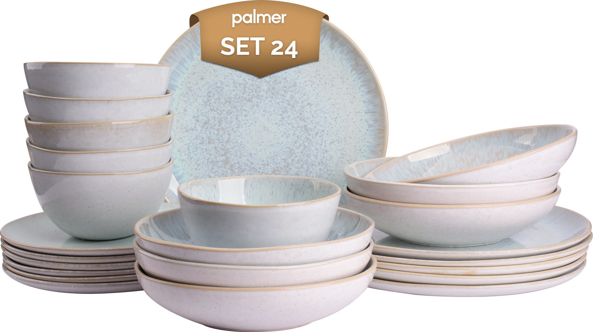 Gesamtsortiment Wohnen Geschirr + Bar Geschirr Geschirrset Geschirr & Besteck - EAN:4262487299377 - Das Lave Tafel-Set von like. by Villeroy & Boch ist eine exquisite Steingut-Kollektion, die durch ihr skandinavisches Design und intensive Farben besticht. Jedes Stück des 12-teiligen Sets ist mit einer speziellen Glasur versehen, die unterschiedliche Farbnuancen hervorbringt, wodurch jedes Element zu einem einzigartigen Kunstwerk wird. Dieses Tafelservice ist ideal für gemeinsame Mahlzeiten und setzt köstliche Speisen besonders in Szene. Das Set umfasst sechs Speiseteller mit einem Durchmesser von 28 cm und sechs Schalen mit einem Durchmesser von 21 cm, die sowohl funktional als auch ästhetisch ansprechend sind. Die Kombination aus ansprechendem Design und praktischen Eigenschaften macht dieses Geschirrset zu einer hervorragenden Wahl für jeden Esstisch. - Hergestellt aus hochwertigem Steingut für Langlebigkeit und Robustheit - Einzigartige Glasur sorgt für individuelle Farbnuancen bei jedem Stück - Spülmaschinenfest und mikrowellensicher für einfache Handhabung - Skandinavisches Design, das zeitlose Eleganz in jede Tischdekoration bringt. - gefunden von Kelkoo Ein exklusives 24-teiliges Tafelservice für 6 Personen mit Seidenglanz, das durch sein einzigartiges Design und den hohen Preis im oberen Segment angesiedelt ist. ![]() kaufland.d e Palmer Light Blue Sea Steingut Geschirr-Set für 6 Personen - Tafelservice 24-tlg. grau hellblau weiß beige, Seidenglanz, spülmaschinenfest 533567