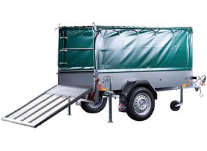 Kategorie: PKW-Anhänger - STEMA - GTIN:4024187205702 - Nutzabmessungen (L x B x H) 201 x 108 x 113 cm|1 gegen Durchrostung|750 kg zulässiges Gesamtgewicht|Anhänger mit 599 kg Nutzlast|Planenset 80 cm hoch; Bei dem Einachser-Anhänger 'Basic Plus 750' handelt es sich um einen ungebremsten Tieflader mit einem maximal zulässigen Gesamtgewicht von 750 kg. Er verfügt über ein stabiles Fahrgestell mit Sicherheits-V-Deichsel, robuster Gummifederachse mit Einzelradaufhängung und wartungsfreiem Kompaktradlager, die die tägliche Handhabung erleichtern. Du kannst die Rückwand ausklappen und aushängen und mit stabilen Winkelhebelverschlüssen verriegeln. Der Anhänger ist außerdem mit einem Rückfahrscheinwerfer, einem Stützrad und Unterlegkeilen ausgestattet. Die Bordwände sind mit einer Alu-Zink-Mischung beschichtet und haben so einen guten Korrosionsschutz. Dadurch erhältst du 1 gegen Durchrostung. Die 4 Verzurrösen haben eine Tragkraft von je 100 daN. Einhängeknöpfe zur Befestigung der Hochplane sind bereits am Anhänger montiert. Mit dem Red Nose-Kupplungsschutz wird der Stoßfänger deines Autos vor Beschädigungen beim Ankuppeln bewahrt. Der Anhänger kann für eine Geschwindigkeit von bis zu 100 km/h angemeldet werden. - 979,00 Euro bei toom.de - gefunden von billiger.de Dieser Motorradanhänger für 1095 Euro ist speziell für den Transport von bis zu drei Motorrädern konzipiert und somit ideal für Biker. ![]() ![]() Stema Motorradanhänger MT 750 BS3 (Nutzlast: 583 kg, Einachser, Geeignet für: Bis zu 3 Motorräder, Ungebremst)