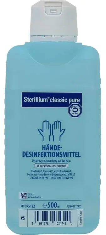 Verfügbarkeit: 1-3 Werktage - 13,48 €/l - Kategorie: Arzneimittel - Hartmann - GTIN:4150193830154 - PZN:19383015 - Sterillium Gel 500 ML - 6,74 Euro bei onfy.de - gefunden von billiger.de Dieses Angebot ist mit 6.89 Euro eine günstige Option für die "classic pure" Variante. ![]() ![]() Sterillium classic pure Händedesinfektion 500ml