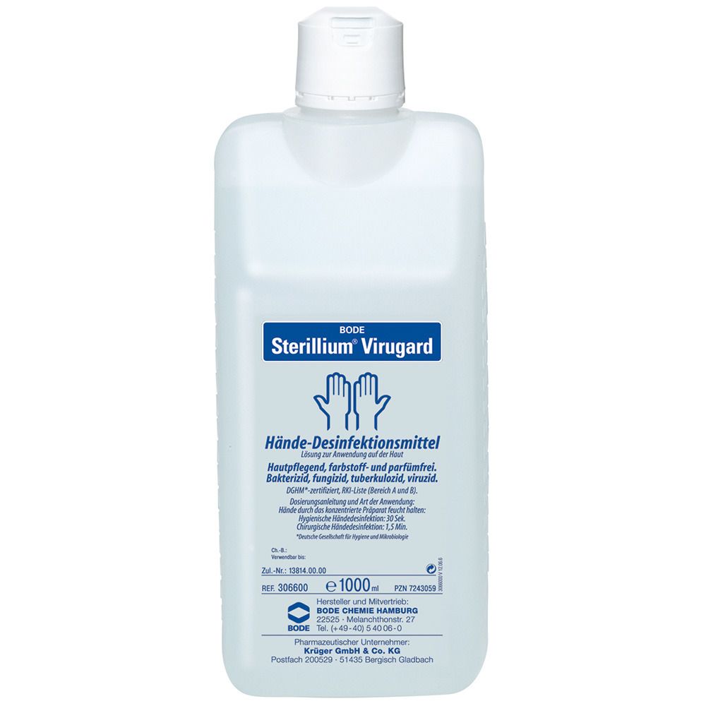 Sterillium virugard 1000 ml META PreisvergleichMit dem Meta-Preisvergleich suchen Sie gleichzeitig bei den großen Preisvergleich Portalen!Jetzt live Suche nach sterillium virugard 1000 ml starten! Sterillium virugard 1000 ml KaufberatungSterillium Virugard 1000 ml ist ein hochwirksames, farbstoff- und parfümfreies Händedesinfektionsmittel von Bode Chemie (Hartmann-Gruppe), das für hygienische und chirurgische Desinfektion in Risikobereichen wie Intensivstationen oder Laboren empfohlen wird. Es wirkt voll viruzid gegen behüllte und unbehüllte Viren (inkl. Noroviren, SARS-CoV-2), Bakterien, Pilze und Mykobakterien, mit RKI-Listung in Wirkungsbereichen A/B.[1][2][3][4][5] Wichtige Hinweise beim Kauf und GebrauchBeachten Sie als Biozidprodukt die Etikettanweisungen: Vor Gebrauch immer lesen, unverdünnt auf trockene Hände einreiben (mind. 3 ml für 30 Sekunden bei hygienischer Desinfektion), hautverträglich bei intakter Haut (beliebig oft nutzbar), aber bei längeren Handschuhkontakten Nitril/Latex vermeiden. Haltbar 12 Monate nach Anbruch bei Raumtemperatur, für Kinder ab 3 Jahren geeignet.[2][3][7] Beliebte Produktmerkmale, Marke und Modelle