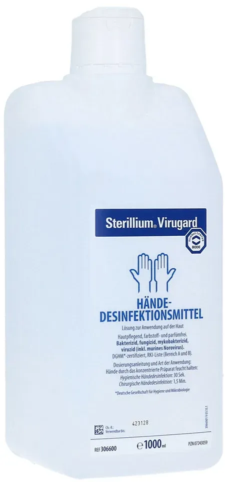 Zustand: Neu - 11,44 € / l - Handdesinfektionsmittel - Bode PAUL HARTMANN - 7243059 - EAN: 4031678000265 EAN: 4150072430598 EAN: 0704679357204 - -Besonders wirksam gegen behüllte und unbehüllte Viren -norovirus-wirksamkeit innerhalb der hygienischen Händedesinfektion -rki-empfehlung bei Noroviren - Farbstoff- und Parfüm frei - 32 Händler im amazon.de Marketplace Dieses eBay-Angebot für 11,49 Euro ist eine preiswerte Option für Käufer, die gerne auf dieser Plattform einkaufen. ![]() ![]() Sterillium Virugard - 1000ml Flasche eBay Händedesinfektion Desinfektionsmittel