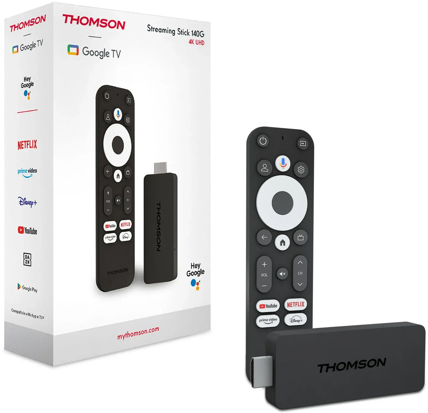 TV-Module Gesamtsortiment IT + Multimedia TV + Heimkino Streaming Box TV-Zubehör - EAN:3662428218091 - Verwandeln Sie mit dem Android TV Stick jeden HDMI-Fernseher in einen Smart-TV. Geniessen Sie Ihre Lieblingsinhalte in 4K Ultra HD über eine stabile und schnelle WiFi-Verbindung. Der Stick ist kompakt, einfach zu installieren und enthält eine Infrarot-Fernbedienung, mit der Sie intuitiv zwischen Ihren Apps wie Netflix, YouTube oder Prime Video navigieren können. Das Kinoerlebnis direkt zu Ihnen nach Hause. Eigenschaften und Produktmerkmale: Geniessen Sie 4K Ultra HD-Bildqualität, die Ihre Filme und Serien veredelt. Verwandeln Sie Ihren HDMI-Fernseher in einen echten vernetzten Smart TV. Einfaches Navigieren mit der intuitiven Infrarot-Fernbedienung. Sofortiger Zugriff auf Ihre Lieblings-Apps: Netflix, YouTube, Prime Video. - gefunden von Kelkoo Ein THOMSON Google TV Streaming Stick mit 4K UHD, Google Assistant und Dolby Atmos für ein immersives Seherlebnis. ![]() ![]() THOMSON Google TV Streaming Stick 140, 4K UHD, Google Assistant, Googlecast, Wi-Fi, Bluetooth 5.0, HDMI, Dolby Atmos, DTS Digital Surround, HDR10, 2 GB RAM, 8 GB Speicher