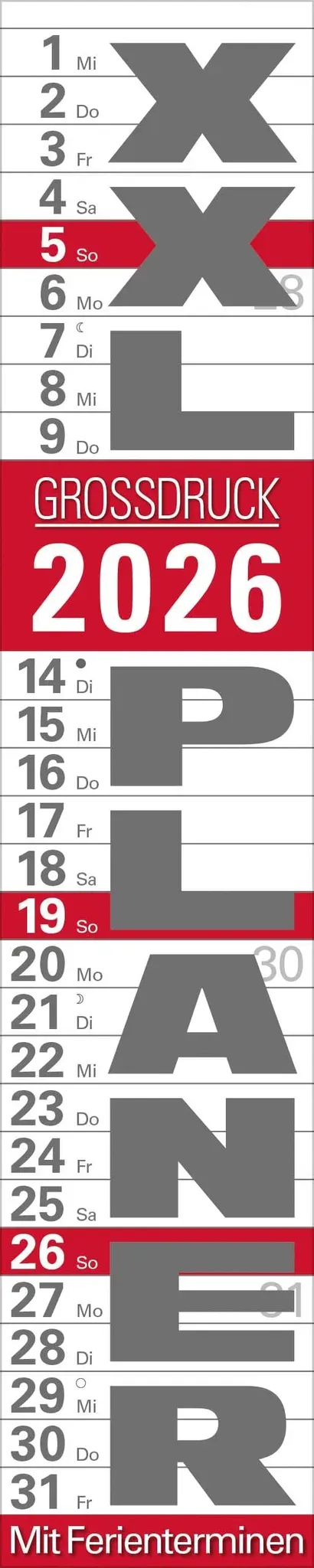 Kategorie: Bücher - Korsch Verlag - GTIN:9783731879640 - Produktmerkmale Format: 17 x 85 cm; schmaler Wandkalender mit viel Platz für Termine Kalendarium auf Deutsch, Englisch, Französisch und Italienisch mit hervorgehobenen Sonn- und Feiertagen für D, A und CH Mit Spiralbindung und Datumsschieber Gedruckt auf umweltfreundlichem FSC Papier Attraktiver Streifenplaner im Super-Lang-Format. Viel Platz für persönliche Eintragungen. Mit Spiralbindung, Datumsschieber und Ferienterminen. Sonn- und Feiertage rot markiert. Kalendarium in deutscher Sprache. - 12,99 Euro bei Amazon Marketplace Automotive - gefunden von billiger.de Dieser Korsch Verlag XXL Planer ist eine preisgünstige Option mit großer Schrift und guter Lesbarkeit. Hugendubel .de Korsch Verlag GmbH Xxl Planer Großdruck Rot 2026