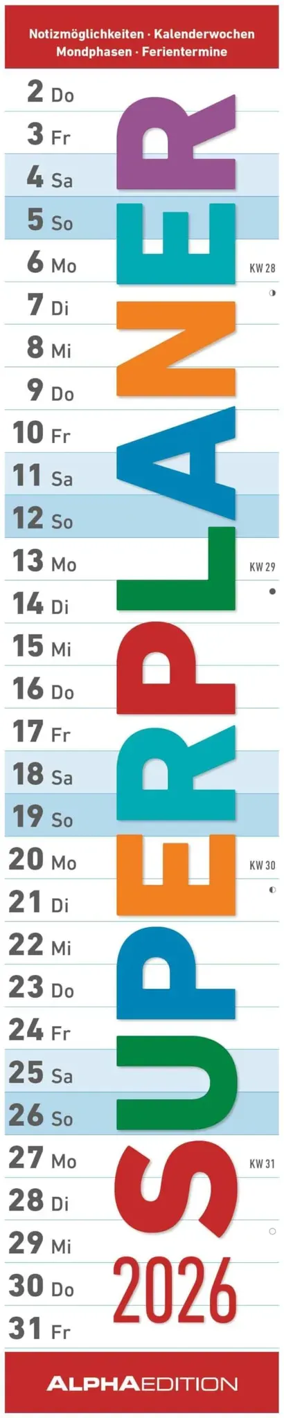 Kategorie: Organizer - Neumann - GTIN:4069095007550 - Der Superplaner 2026 von Alpha Edition ist der praktische Streifenkalender für eine übersichtliche Jahresplanung. Mit neutralem Design, farblich abgesetzten Wochen und viel Platz für Eintragungen ist er ideal für Küche, Büro oder Flur. Highlights: Viel Platz: Großzügiges Format 17 85 cm für Termine, Notizen und Erinnerungen übersichtliche Gestaltung: Farblich voneinander abgesetzte Wochen für schnelle Orientierung Praktische Extras: Ferientermine für DE/AT/CH im deutschsprachigen Kalendarium Hochwertige Qualität: Einfache Handhabung: Stabile Ringbindung zum bequemen Umblättern und sicheren Aufhängen Behalten Sie Ihre Termine im Blick der Alpha Edition Superplaner 2026 kombiniert Funktionalität mit einem klaren, strukturierten Layout für jeden Tag im Jahr. - 9,89 Euro bei Thalia.de - gefunden von billiger.de Der Mega Notes 2026 ist eine interessante Option mit farblich abgegrenzten Wochenenden, was die Übersichtlichkeit erhöht. ![]() ![]() Mega Notes - 2026 - eBay Streifenplaner 17x85 cm - mit farblich abgegrenzten Wochenende