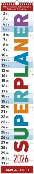 Zustand: Neu - Wandkalender - Alpha Edition ALPHA EDITION - - EAN: 4069095007550 - - 17 Händler im amazon.de Marketplace Der Neumann Superplaner 2026 ist hier noch günstiger erhältlich und bietet alle Vorteile der Alpha Edition. ![]() ![]() Neumann Superplaner 2026 - Streifenkalender 17x85 cm - mit Ringbindung - viel Platz für Notizen - Langplaner - Wandkalender - Küchenkalender - Alpha Edition