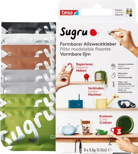 Zustand: Neu - 3,51 € / Stück - Universalkleber - sugru tesa - Moldable Glue I000941 - EAN: 4063565057892 - Der knetbare Alleskleber, mit dem Ihr Heim noch schöner und individueller wird: Dekorieren, Upcyclen, Kleben und vieles mehr - die Reparaturknete wird einfach mit den Fingern nach Bedarf geformt Nutzen Sie den 'Faktor Farbe': Zum Reparieren von Geschirr aus Porzellan, Glas und Keramik, zum Fixieren von Dekoration, als Bastelkleber oder zum kreativen instand setzen defekter Gegenstände Daten werden abgerufen. Warten Sie ein paar Sekunden, und versuchen Sie noch mal, auszuschneiden oder zu kopieren. Leistungsstark und universal - Indoor und Outdoor nutzbar: Hält bis zu 2 kg Belastung - wasserfest sowie UV- und temperaturbeständig, spülmaschinenfest - Ideal für Anwendungen in Haus und Garten Für viele Materialien wie Glas, Keramik, Holz, Metall und Kunststoffe geeignet - einfache Anwendung: bis zu 30 Minuten die Klebeknete nach Bedarf formen - nach dem Fixieren 24 Stunden aushärten lassen - Verkäufer: vavado im amazon.de Marketplace ![]() ![]() Sugru by - Tesa formbarer eBay Kleber x 3er-Pack - langes Datum - bestes Preis-Leistungs-Verhältnis ³schwarz/weiss/grau