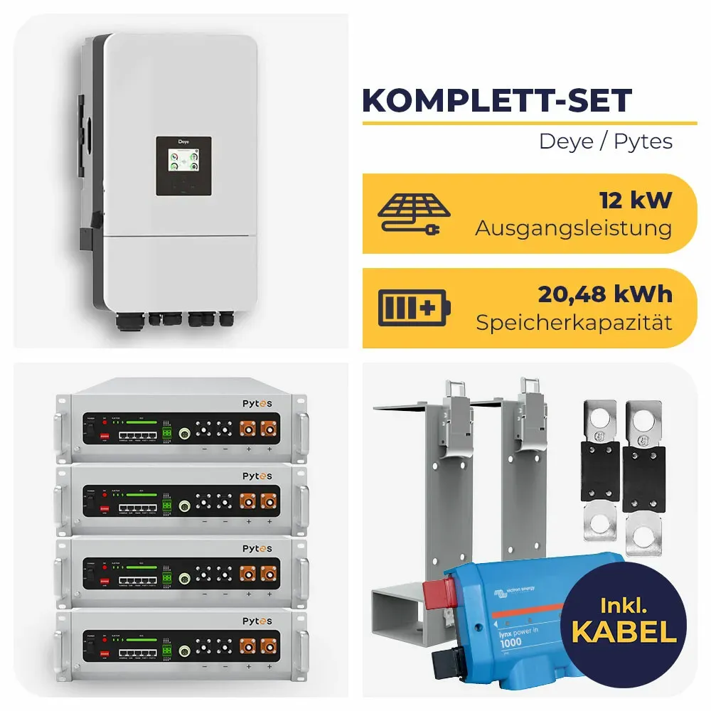 Kategorie: Solaranlagen - DEYE - Hier haben wir ein Set für Dich zusammengestellt, mit dem Du Deine Photovoltaikanlage mit dem Deye Hybrid-Wechselrichter SUN-12K-SG04LP3-EU und einem Deye Batteriespeichermodul RW-M6.1-B mit 6,14 kWh Speicherkapazität ausstatten kannst. Der Wechselrichter hat die Leistungsklasse von 12 kW. Dieser Wert bezieht sich auf die maximal mögliche Gesamtleistung Deiner PV-Module. Infos zu den Einzelkomponenten dieses Sets Deye SUN-12K-SG04LP3-EU Hybrid-Wechselrichter Hybrid-Wechselrichter sind das Herz einer jeden Photovoltaikanlage. Sie nehmen den Gleichstrom der PV-Module auf und leiten ihn wahlweise in den Speicher, in das Heimnetzwerk und/oder in das öffentliche Netz weiter. Hierfür invertieren sie den Gleichstrom auch in den haushaltsüblichen Wechselstrom. Der SUN-12K-SG04LP3-EU gehört zu den absoluten Bestsellern, denn er überzeugt durch Leistung, durch Zuverlässigkeit und durch Robustheit. Er lässt sich fernsteuern, wodurch Du Deine PV-Anlage von nahezu jedem Ort dieser Welt aus überwachen und justieren kannst. Der in diesem Set enthaltene 12 kW Hybrid-Wechselrichter ist die neuste Generation, die mit WiFi-Dongle und Magnetringen ausgestattet ist. 1 Hersteller- . Alle Infos zu diesem hochwertigen Inverter findest Du auf unserer Produktseite zum Deye Hybrid-Wechselrichter SUN-12K-SG04LP3-EU. Deye RW-M6.1-B Batteriespeicher 6,14 kWh Dieser Niedervolt-Batteriespeicher überzeugt durch seine zuverlässige Speicherleistung. Seine LiFePO4-Zellchemie ... Ein Komplettset mit einem 10,5 kWh Felicity Batteriespeicher, das ein gutes Preis-Leistungs-Verhältnis für eine mittlere Speicherkapazität bietet. ![]() ![]() Deye Felicity Komplettset 12 kW Hybridwechselrichter (SUN-12K-SG04LP3-EU) & 10,5 kWh LUX-E-48200LG03 Felicity Batteriespeicher