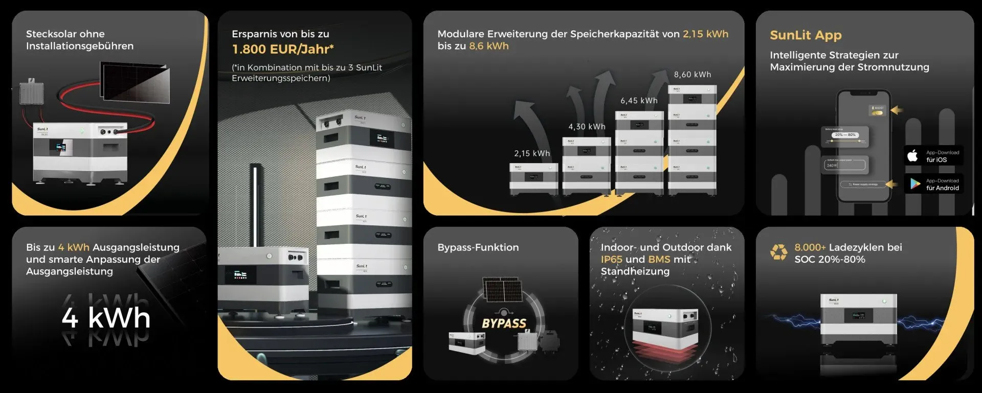 | Modell | Kapazität | Highlights | Kompatibilität | |--------|-----------|------------|---------------| | SunLit BK215 | 2,15 kWh | Kopfmodul mit PV-Hub, LCD-Display, 2 MPPT-Eingänge | Deye, APsystems | | SunLit B215 | 2,15 kWh (Erweiterung) | Stapelbar, Plug-and-Play | Bis 8,6 kWh Gesamt | | SunLit EV3600 | Wechselrichter | Bidirektional, EV-Ladung, 11 kW AC | Mit BK215 kombiniert | | SunLit Max 1000 bifazial Pro | Komplettset | Bifaziale Module, Speicher-ready | Hoher Wirkungsgrad | Diese Modelle dominieren Shops und Tests als flexibelste Speicherlösung.[1][4][5][10] Empfohlener Preisbereich