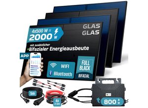 Erneuerbare Energie Wohnen Haus Garten Heimwerken - - Balkonkraftwerk von SUNNIVA ® 2000 W / 800 W Das premium hochwertige Balkonkraftwerk von SUNNIVA ® mit einer Maximalleistung von 2000 W / 800 W enthält einen Wechselrichter, dessen Leistung 800W beträgt und der per Plug Play in wenigen Minuten ei - Versandkostenfrei: true - Lieferzeit: 10 Tage - product_flag_accessory_wohnen: true - - - bei Marktkauf - gefunden von shopping24 Ein 2000W Balkonkraftwerk mit ASTRO-E 800W Wechselrichter, das eine solide Leistung und Markenqualität kombiniert. ![]() SUNNIVA® 2000W Balkonkraftwerk BIFAZIAL FULLBLACK komplett Steckdose ASTRO-E 800 Watt Wechselrichter, PV Solaranlage Komplettset, 4x 500W N-Type Glas-Glas Bifacial Solarmodule, 5m Kabel 4x 2.5m Solarkabel