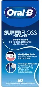 0,08 / 1 st - Kategorie: Arzneimittel - WICK - GTIN:8700216539043 - PZN:19685868 - Oral-B Zahnseide SuperFloss Threader 50 St von WICK Pharma Zweigniederlassung der Procter & Gamble GmbH günstig bei Ihrer Beraterapotheke bestellen - 4,11 Euro bei Beraterapotheke - gefunden von billiger.de Dieses Oral-B Superfloss ist mit 4.42 Euro ein günstiges Einzelpack und gut zum Ausprobieren geeignet. ![]() claras- apotheke.d e Oral-B Superfloss Zahnseide, 50 St