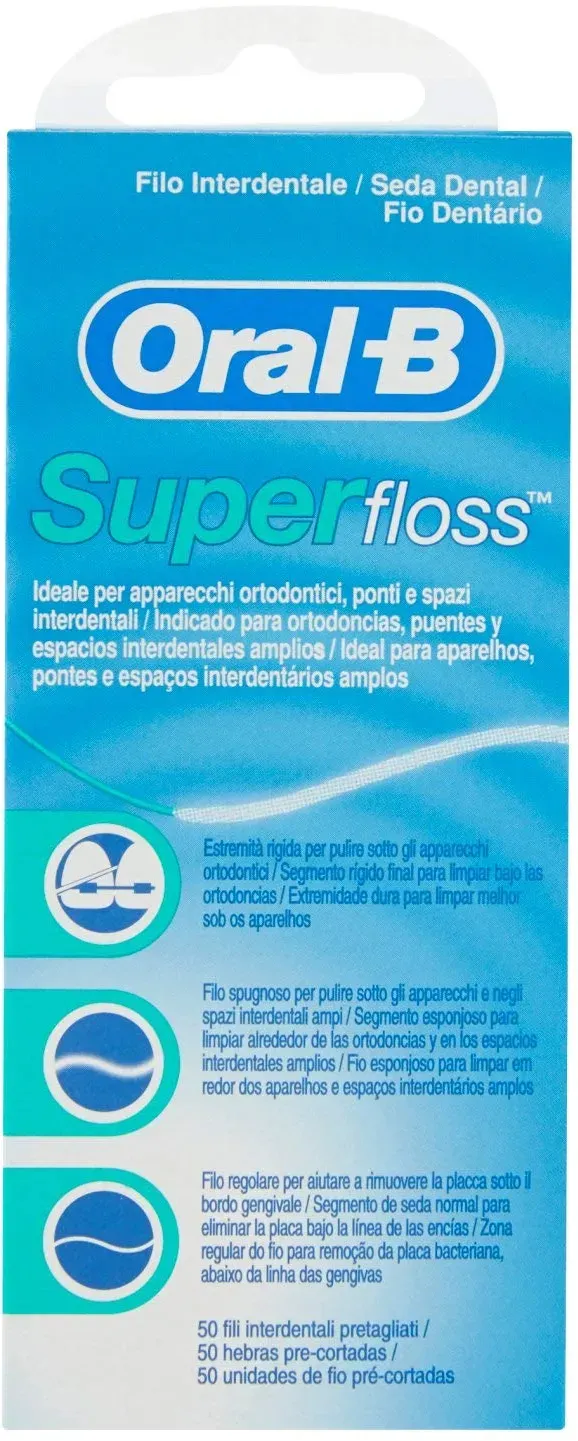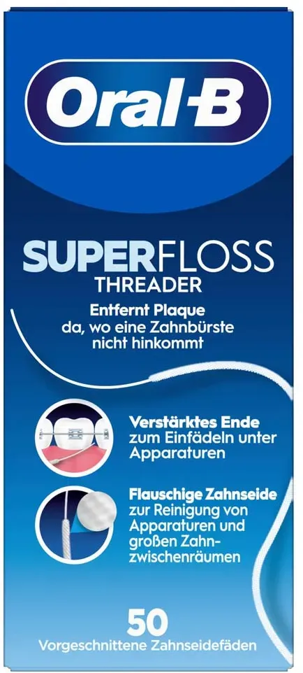 0.14 / stück - Kategorie: Zahnpflegeartikel - Oral-B - 3-in-1-Zahnseide, ideal für Zahnspangen, Brücken und breite Zahnzwischenräume Verstärktes Ende zur Anwendung beim Tragen von Zahnspangen oder Brücken Flauschiger Mittelteil zur schonenden Reinigung um Zahnspangen oder Brücken und in breiten Zahnzwischenräumen 50 vorgeschnittene Fäden Mit Minzgeschmack - 7,21 Euro bei Amazon Marketplace Health & Personal Care - gefunden von billiger.de Dieses 4x50er Pack Oral-B Superfloss ist eine größere Packung für regelmäßige Anwender und bietet ein gutes Preis-Leistungs-Verhältnis für 14.87 Euro. ![]() ![]() Oral-B Oral B Superfloss Zahnseide, Entfernt Plaque & Zahnstein, Verstärktes Ende oder Flauschige Mitte für enge und weite Räume, Zur Reinigung von Zahnspangen und Apparaturen,4x50 vorgeschnittene Fäden,Blau
