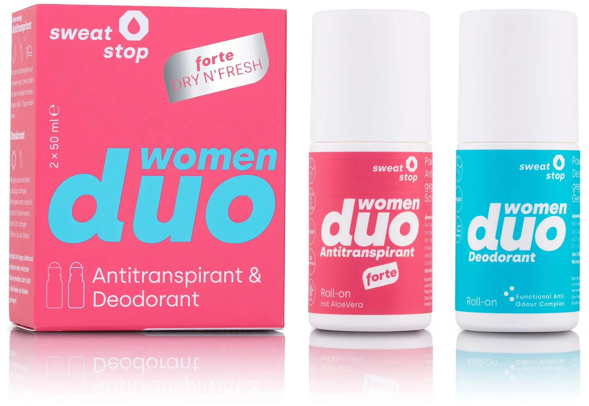 Kategorie: Deodorants - Sweat Stop - GTIN:7640139730114 - Antitranspirant gegen Schwitzen & Schweißflecken: SweatStop Aloe Vera SENSITIVE Roll-on für die Achseln bekämpft Schweiß- & Geruchsbildung für 24-48h. Für Sie & Ihn. Pflanzliche Zusätze für eine schonende und pflegende Anwendung: Mit Aloe Vera und weiteren Zusätzen. Anwendung vor dem Schlafengehen. Dermatologisch sehr gut getestet. Ohne Farb- & Parfümstoffe. Vegan. Drei Produktstärken: SENSITIVE bei überdurchschnittlichem, FORTE bei starkem, FORTE PLUS bei sehr starkem Schwitzen ohne Anstrengung. SweatStop Aloe Vera SENSITIVE Antitranspirant Roll-on für die Achseln wird seit 2006 in DE hergestellt. - 18,90 Euro bei Amazon Marketplace Beauty - gefunden von billiger.de Ein Duo-Set für Frauen, das starken Schutz und Deodorant-Wirkung kombiniert, ideal für empfindliche Haut. ![]() ![]() Sweat Stop SweatStop Duo Women Antitranspirant & Deodorant Set gegen starkes Schwitzen & Geruch | 2 x 50ml Roll-on Antiperspirant mit Duft & Deo | Gegen Schweiß für empfindliche Haut | Duo Power Protection